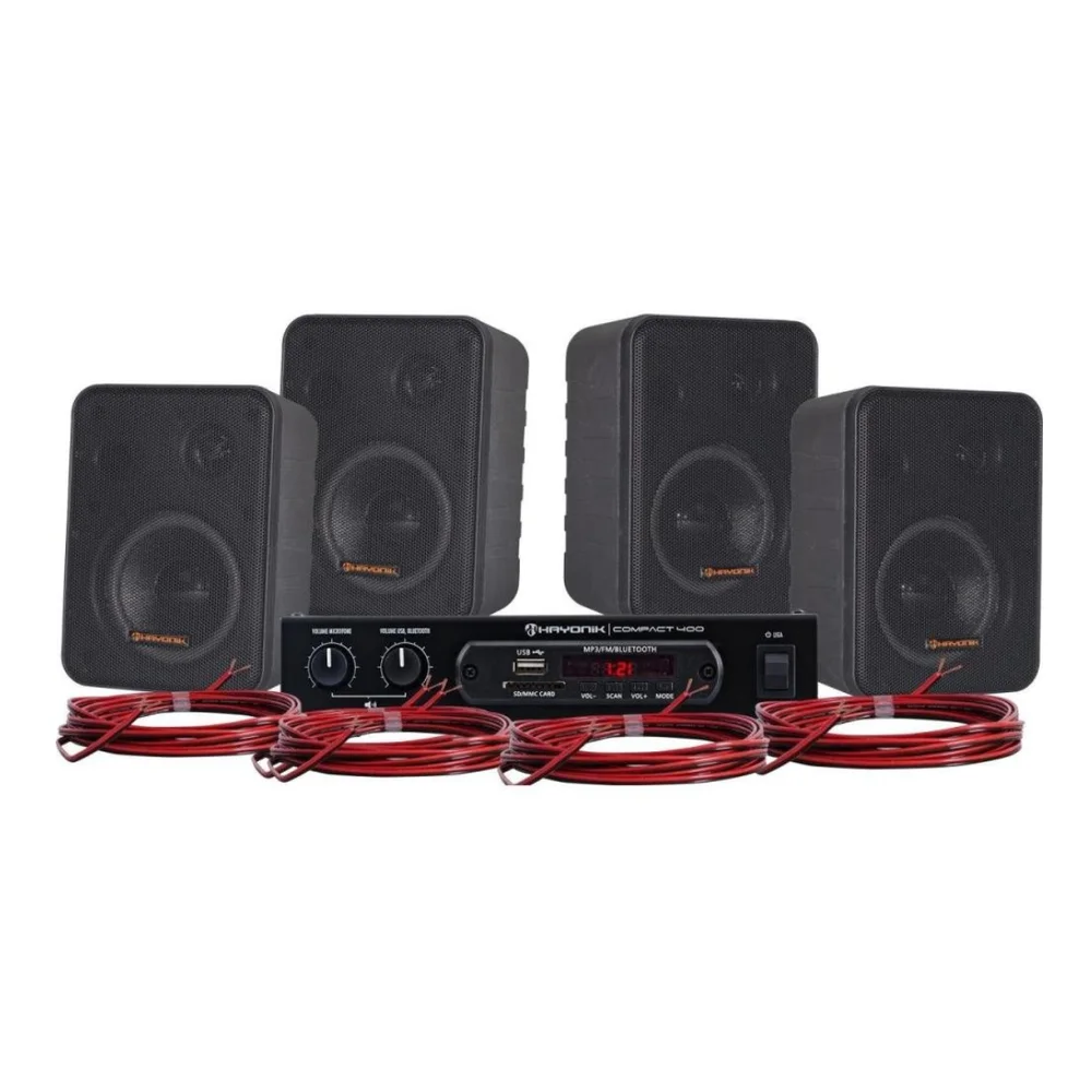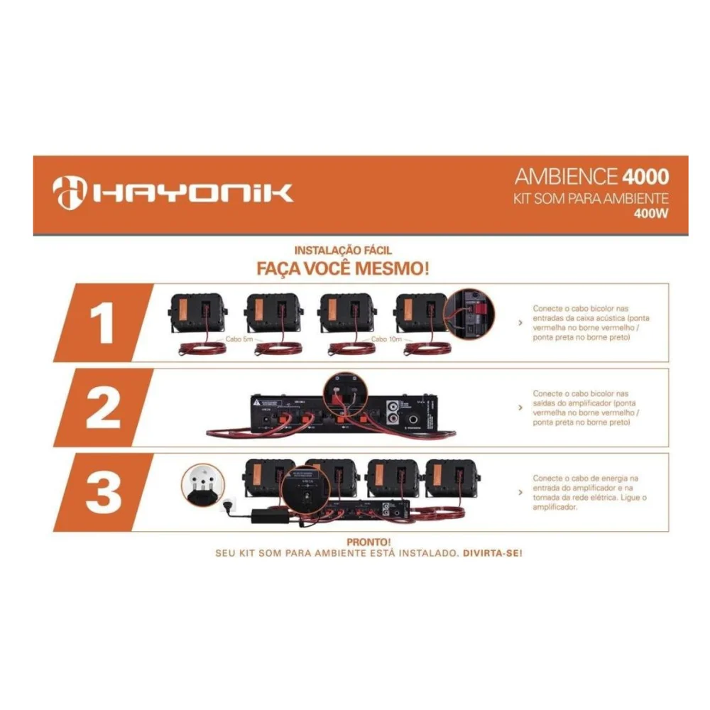 o kit para som ambiente ambience line da hayonik possibilita sonorizar seu ambiente de forma prática e com grande facilidade. composto por 1 amplificador compact 400, 4 caixas acústicas msb406, 2 cabos bicolor de 5m cada e 2 cabos bicolor de 10m cada, sua instalação é simples, prática e rápida.