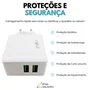 Conectividade e Recursos: Bivolt com duas portas USB de 3.1A para carregamento simultâneo, compatível com diversos dispositivos e tecnologia Auto ID