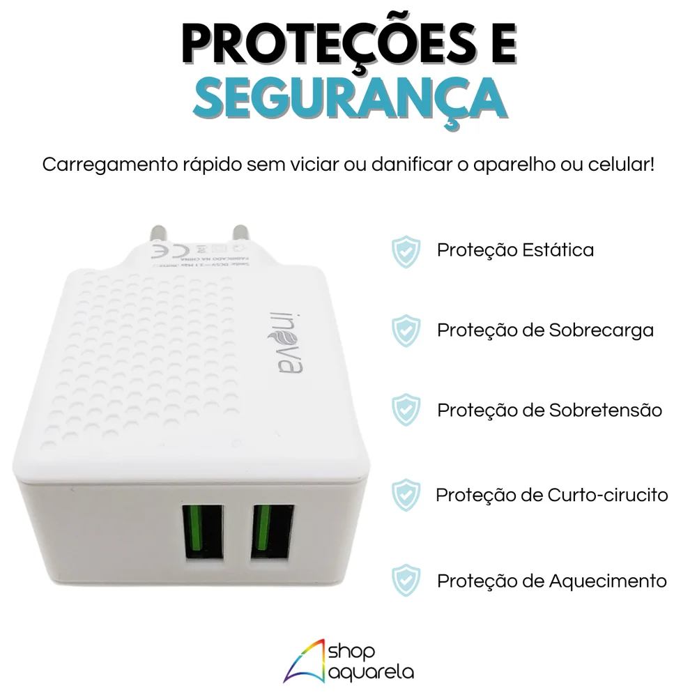 Destaques que fazem a diferença: • carregamento rápido e inteligente com até 3.1a • duas portas usb para carregar dois dispositivos simultaneamente • tecnologia auto id: ajusta automaticamente a energia fornecida • design compacto e fácil de transportar • compatível com qualquer modelo de smartphone • proteção contra curto-circuito, sobrecarga e superaquecimento • acompanha cabo carregador micro-usb