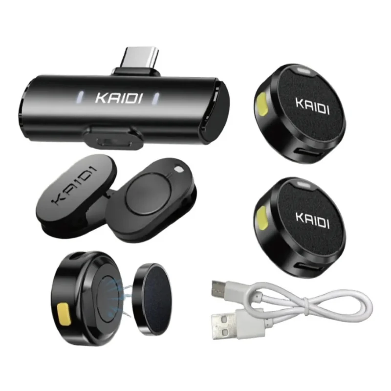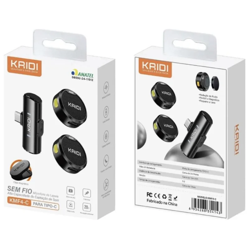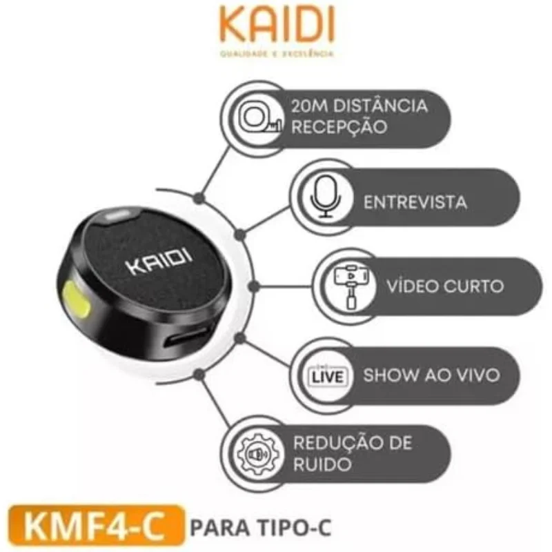 Gravações com áudio limpo, sem fios e com liberdade total!n O Microfone Duplo Sem Fio Lapela KMF4-C foi desenvolvido para criadores de conteúdo, jornalistas, professores e profissionais que precisam de áudio nítido, sem ruídos e com mobilidade. Compatível com dispositivos com entrada USB Tipo-C, como smartphones Android, tablets e notebooks, ele garante gravação de alta qualidade com facilidade plug & play.