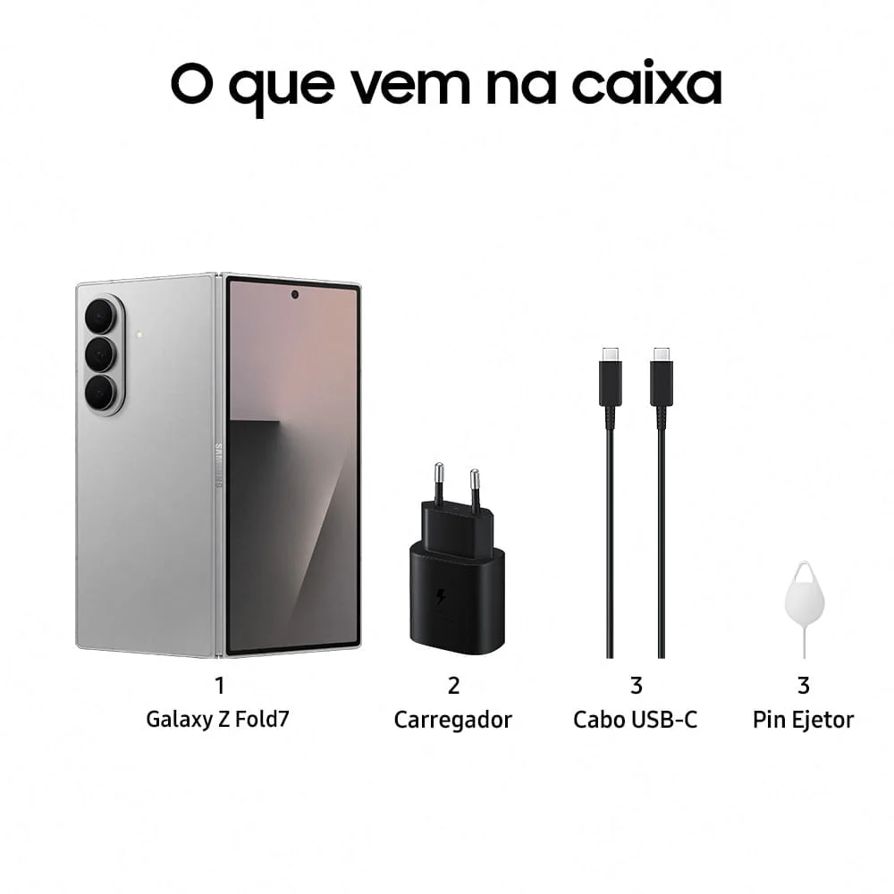 celular samsung galaxy z fold7 com tela dobrável de 8.0” amoled dinâmico 2x (aberto) e 6.5” amoled dinâmico (fechado), 512gb, 12gb de ram, câmera tripla traseira de 200mp (dual pixel, ois) + 12mp (ultra wide) + 10mp (telefoto, ois) frontal de 10mp (aberto), frontal de 10mp (dual pixel) (fechado), bateria de 4400mah com carregamento super-rápido de 25w, dual chip, android 16chegou o lançamento que vai revolucionar o mercado. samsung apresenta o novo galaxy z fold7, é o smartphone mais fino e mais leve do que nunca, projetado para multitarefa e melhor experiência de visualização, desdobre sua produtividade. redesenhado para ser o fold mais fino e leve já feito. o z fold7 conta com um novo design inovador, fino e leve que torna o uso do dia a dia mais confortável. tamanho da tela otimizado, sendo sua tela principal de 8,0” e tela externa de 6.5”. tela maior para facilitar a digitação e utilização mais confortável. dobre para ter o tamanho de um celular e abra para ter uma tela ampla semelhante a um tablet. sincronize os conteúdos da tela principal para tela externa. produtividade maximizada com tela dividida em um display maior.com a câmera de alta resolução de 200 mp, o z fold7 permite que você capture momentos únicos em todas as condições de iluminação. desfrute da edição em uma tela maior, detalhe nítido em cada clique:clareza equivalente à do galaxy s25 ultra em cada imagem fotografada. o primeiro galaxy z fold com o modo macro com foco automático, trazendo fotos nítidas à qualquer distância. fotos 56% mais brilhantes, em comparação ao z fold6.abra o galaxy z fold7 para mostrar para quem está sendo fotografado exatamente como você está vendo no visor. com a câmera frontal com ângulo maior de 10mp permite que você capture selfies em grupo, impecáveis com um campo de visão maior. tenha visão mais ampla com detalhes mais nítidos. não vamos esquecer dos vídeos: o galaxy z fold7 permite que você faça vídeos mais nítidos com menos ruído, dia ou noite com o provisual engine de última geração. vídeos noturnos mais vívidos e com mais detalhes com nightography aprimorado. processador exclusivo galaxy, personalizado para o melhor desempenho, qualcomm snapdragon® 8 elite for galaxy (3 nm).o galaxy z fold7 te acompanha em todos os momentos com bateria para o dia todo de 4.400 mah. suporta o carregamento super-rápido de até 25w, sendo assim você não precisa passar muito tempo ao lado da tomada. o gemini e gemini live, ferramentas de ai do google, estão presentes no seu galaxy z fold7. com a ação integrada entra aplicativos, você pode fazer múltiplas tarefas sem trocar de aplicativos. você também pode ter uma visualização dividida para insights mais profundos e detalhados. o gemini live conta com os recursos: - gemini live com câmera: aponte sua câmera para qualquer coisa e converse naturalmente para ter respostas instantâneas sobre o que está sendo capturado. - gemini live com compartilhamento de tela: compartilhe o que você tem na tela e tenha ajuda imediatamente. agora com a nova one ui 8.0, permite você receba sugestões em tempo real com base no conteúdo na tela. interface atualizada da tela de bloqueio, inicial e aplicativos. experiência de uso otimizada para criação, anotação e multitarefa para aumentar a produtividade.tenha uma experiência galaxy mais segura e atualizada com o seu aparelho. o galaxy z fold7 assegura até 7 atualizações de sistema operacional android e até 7 anos de atualizações de segurança. fora isso, a sua proteção é aprimorada com samsung knox, garantindo que dados confidenciais e sigilosos permaneçam seguros, e com cadeado galaxy, protegendo os seus dados e acessos a aplicativos por terceiros.