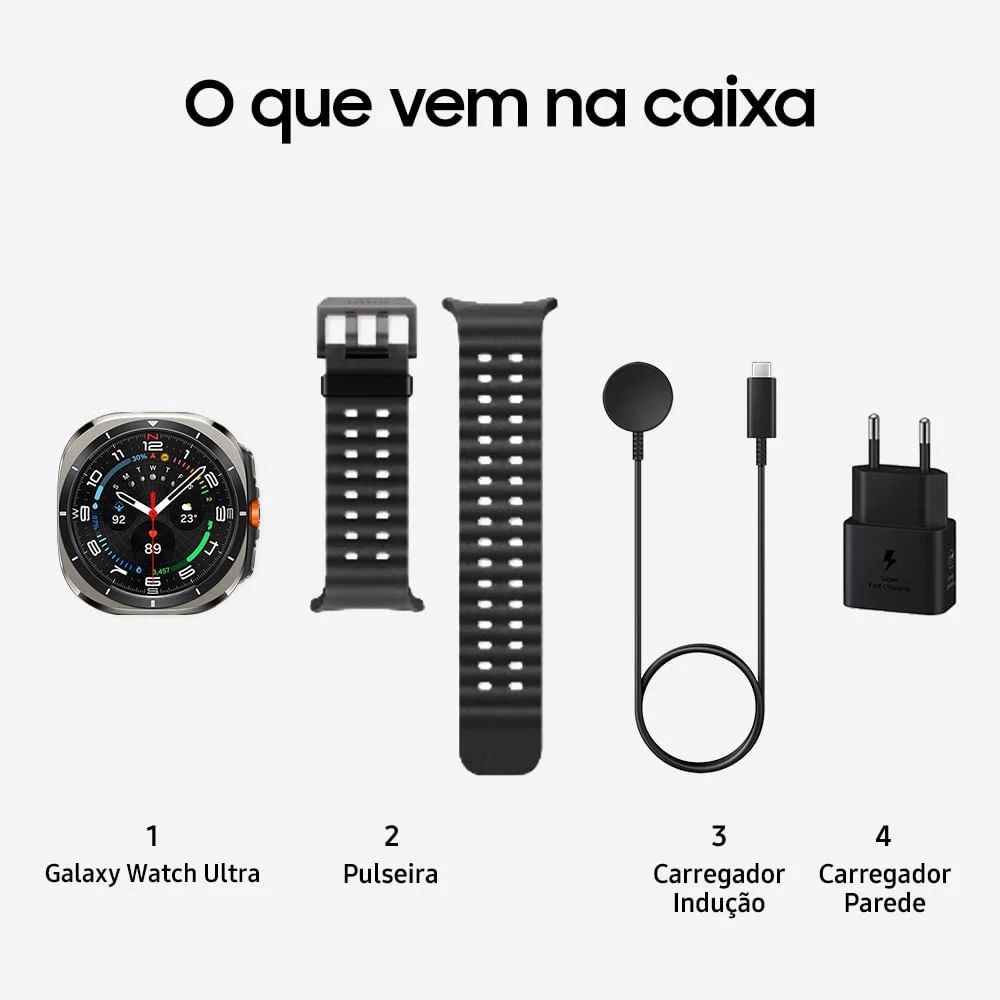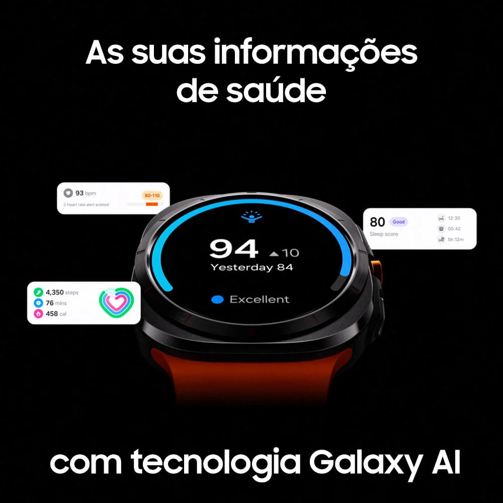 Samsung galaxy watch ultra smartwatch 47mm lte, galaxy ai, titânio aeroespacial, tela em cristal de safira, gps de dupla frequência, monitoramento avançado de saúde, sono e de coraçãoconstruído para ultrapassar os limites, o galaxy watch ultra resiste a até 55 °c de calor, 9.000 m de altitude e 10 atm de pressão da água, suportando tudo isso sem problemas com sua nova estrutura em titânio aeroespacial e vidro em cristal de safira. O novo processador de 3nm potencializa sua rotina diária. Alterne rapidamente entre verificar o clima e monitorar seus treinos em um instante. Além disso, ele otimiza a vida útil da bateria para uma energia de longa duração, garantindo que o seu galaxy ultra acompanhe o seu ritmo. Seja escalando penhascos ou fazendo trilha por dias, ultrapasse os limites sem se preocupar com a recarga durando até 100 horas no modo economia de energia. Fique à frente na sua jornada de bem-estar com o nosso sensor de saúde mais avançado no galaxy watch.com 13 leds, o novo bioactive sensor monitora sua frequência cardíaca, padrões de sono e muito mais com alta precisão. Leve o seu treino para o próximo nível com o galaxy watch ultra. Crie sua rotina de exercícios perfeita com aquecimentos, relaxamentos e intervalos, ou compita contra seus recordes anteriores para se manter motivado. Acompanhe seus treinos facilmente, debaixo do sol escaldante, com sua tela de 3.000 nits. Entenda melhor seu corpo e comece seu dia de forma mais inteligente com a pontuação de energia.verifique seu sono, frequência cardíaca e atividades diárias e planeje sua rotina todos os dias. Não descansou tão bem? Talvez seja melhor pular a academia e relaxar em casa para voltar aos trilhos. Encontre o seu caminho com facilidade com o gps mais preciso de todos os tempos no galaxy watch. O gps de frequência dupla usa duas bandas de sinal de satélite (l1+l5), garantindo rastreamento preciso e consistente, mesmo em meio a densos blocos urbanos. Se suas mãos estiverem ocupadas e alguém ligar, basta pinçar seus dedos duas vezes para atender. Um simples gesto é tudo o que você precisa para tirar uma foto, atender uma chamada ou desligar um alarme. O sensor analise de impedância bioelétrica (bia) pode medir a composição do seu corpo, usando apenas as pontas dos dedos. Defina suas metas de peso, gordura corporal e massa muscular e personalize programas para atingir suas metas de saúde com precisão.