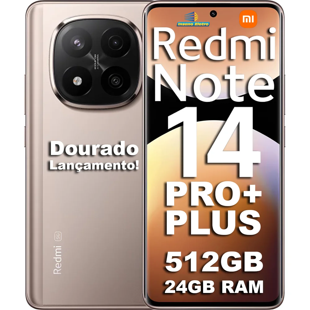 Smartphone xiaomi redmi note 14 pro+ plus dourado / 5g / dual sim / tela 6.67" pol. / 512gb de armazenamento / 12gb ram(física)+12gb ram(virtual) total 24gb de ram / câmera de 200mp / carregador 120w / hyperos 2.0 * original / novo / global / lacrado