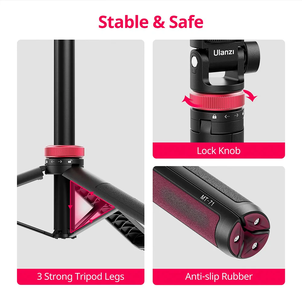 1. Alcance Profissional: O Ulanzi MT-71 é um tripé de selfie e câmera versátil, com extensão de até 150cm (59 polegadas), ideal para capturar ângulos amplos e enquadramentos criativos. Seu design robusto garante estabilidade para seus equipamentos.