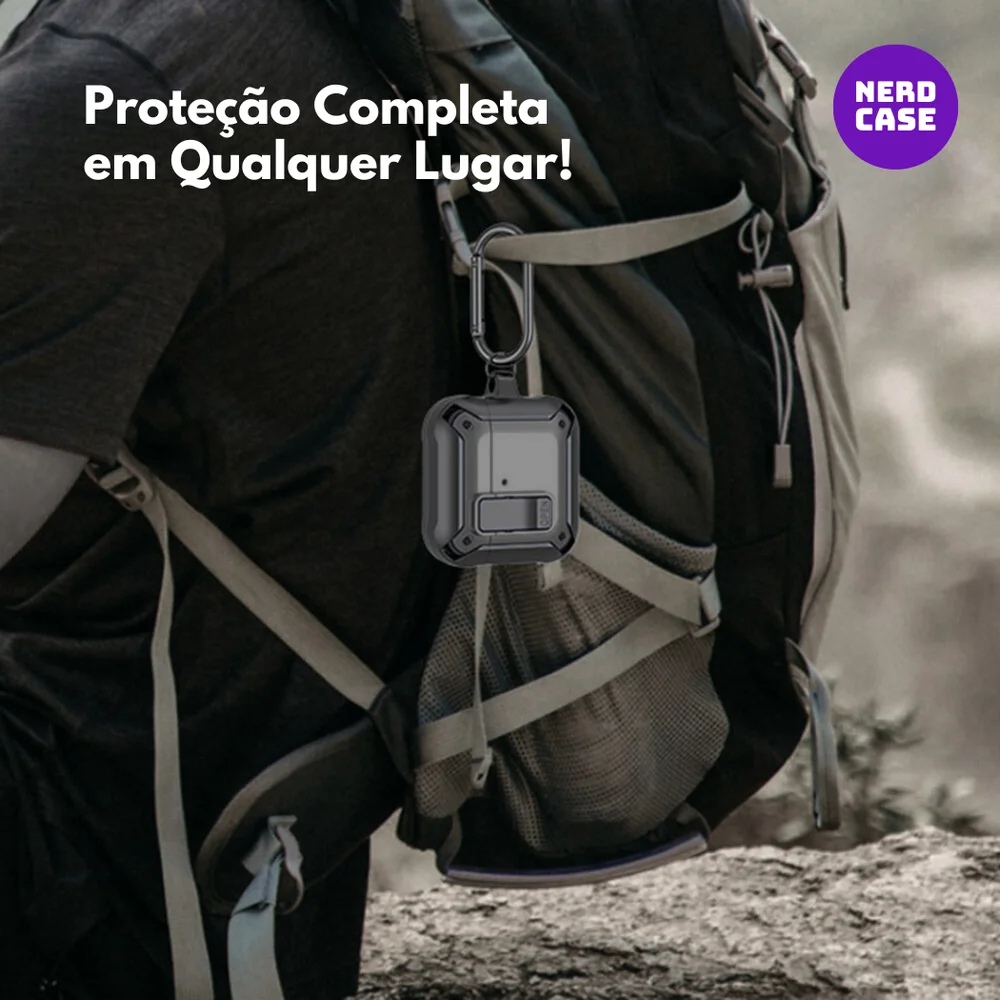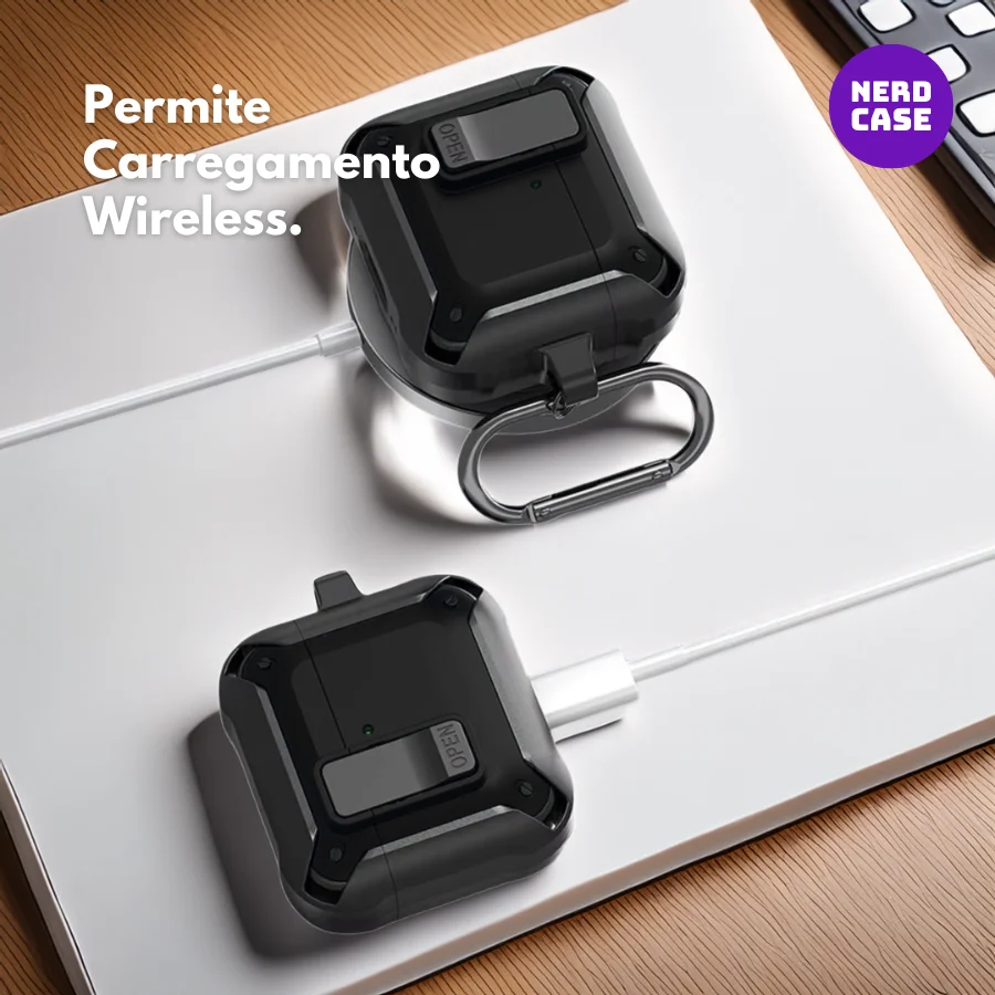 Proteja seus airpods 4 com a capa preta resistente da nerdcase, projetada para máxima durabilidade e estilo. Fabricada com material robusto, a capa oferece proteção superior contra impactos, arranhões e quedas. Conta com um mosquetão prático para transporte seguro e funcionalidade extra. Compatível com carregamento sem fio e com led frontal visível, é ideal para quem busca proteção e conveniência no dia a dia.
