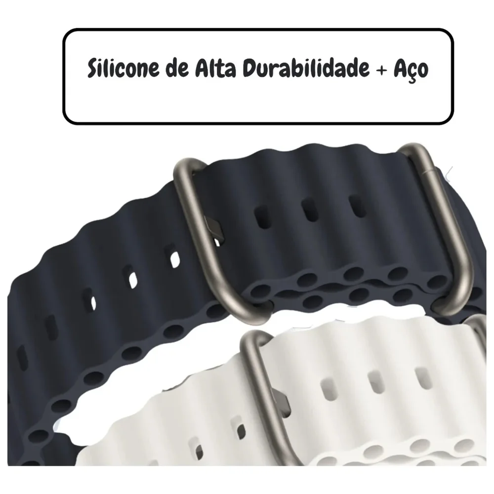 Inove o visual do seu smartwatch com um acessório que combina performance e elegância com a nossa pulseira desenvolvida para um estilo de vida dinâmico. Fabricada em silicone hipoalergênico, esta pulseira é conhecida por sua incrível maleabilidade e toque suave na pele.\n \n as ranhuras foram projetadas de forma inteligente para criar canais de ventilação, permitindo que seu pulso respire livremente. Isso reduz significativamente o acúmulo de suor e calor, proporcionando uma sensação de frescor e bem-estar em qualquer atividade.\n \n a funcionalidade e a segurança são garantidas por um fecho fivela com mecanismo de alta confiança e visual contemporâneo. Este detalhe não só previne que a pulseira se solte, mas também confere um acabamento limpo e elegante ao acessório.\n \n para garantir a sua total satisfação, é fundamental verificar o tamanho exato da pulseira, indicado em milímetros no título do anúncio. A escolha correta assegura o encaixe perfeito com seu relógio e o máximo conforto em seu pulso.