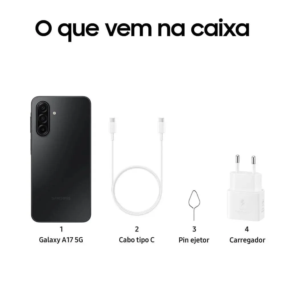 desfrute de alta performance com o samsung galaxy a17 5g, 128gb, ram 4gb, câmera tripla 50mp e selfie 13mp. Tela super amoled de 6.7´´ para imagens nítidas e conexão 5g super rápida.