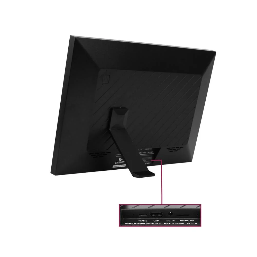 Conectividade: Entradas USB 2.0 e Tipo-C, expansão por cartão SD e compatibilidade com arquivos JPEG, PNG, MP4, AVI e MP3