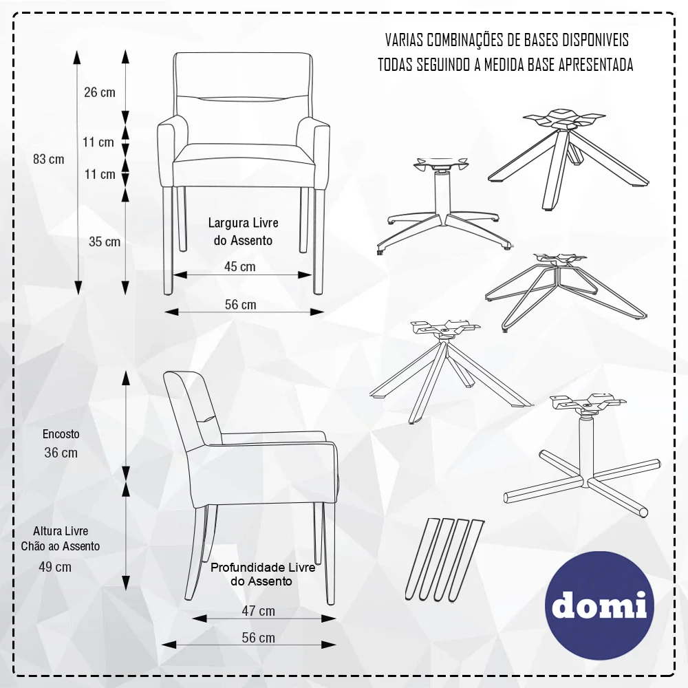 Recursos: Base giratória em aço revestido, apoio de braço compatível com mesas padrão e diversos revestimentos (linho, veludo, etc), já vem montada