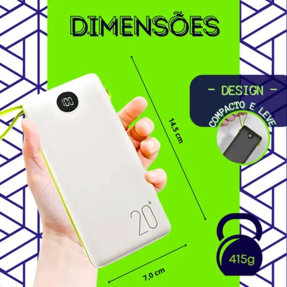 Bateria externa 20000mah genérica, compatível com todos cabos é a escolha perfeita para quem busca praticidade e segurança ao carregar dispositivos. Com capacidade real de 20.000mah, ele garante energia extra em viagens, no trabalho ou em situações de emergência.n n compatível com celulares, tablets e qualquer aparelho que utilize cabos lightning, tipo c ou micro usb, este carregador portátil oferece recarga turbo com saída de 5v. Possui indicador em led, múltiplas entradas e chip inteligente que ajusta a voltagem automaticamente, assegurando máxima proteção contra sobrecarga e curto-circuito.n n compacto, leve e eficiente, este power bank foi projetado para quem não abre mão de mobilidade e confiabilidade. Um aliado indispensável para manter seus dispositivos sempre prontos para uso.