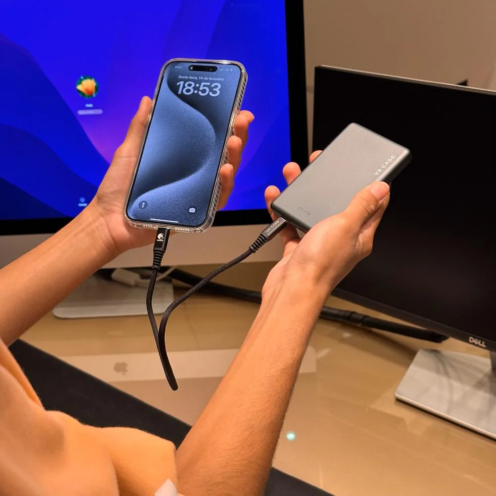 Resumo gerado por IA- Conectividade e Recursos: Compatível com dispositivos Apple, oferece carregamento rápido e eficiente, ideal para uso com power banks e em espaços compactos.
