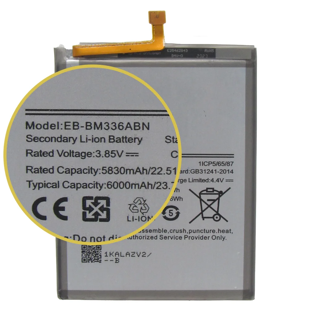 - aplicação: eb-bm336abn - modelo: m22 5g - voltagem: 3,8v - tensão de carga limitada: 4,7v - capacidade: 6000 mah - dimensões: 8,2 x 6,5 x 0,5 cm 57g