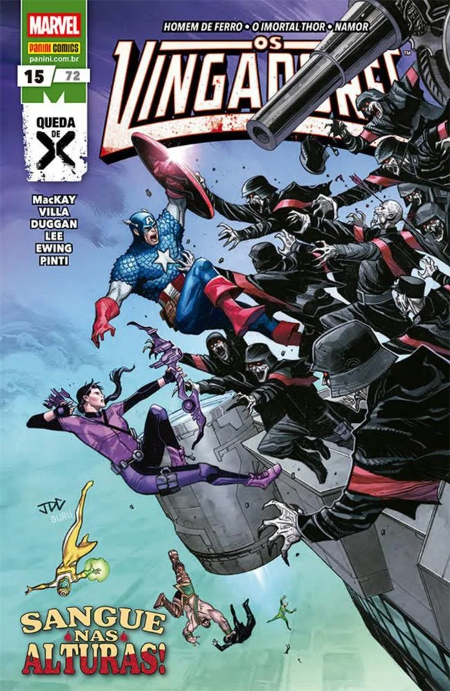 A equipe improvisada de vingadores do capitão américa deve enfrentar um inimigo comandando um exército de vampiros que recai sobre eles dos céus! Ainda nesta edição, homem de ferro enfrentará feilong, então prepare-se para o maior choque de armaduras que você já viu! Enquanto isso, em andlang, a terra dos espíritos, odin desafia thor a lutar pela runa de seu irmão, o deus da guerra tyr, pois ele foi transformado por forças estranhas, por dentro e por fora... E restaurá-lo só teria um custo igual. Além disso, uma espiadinha submarina!