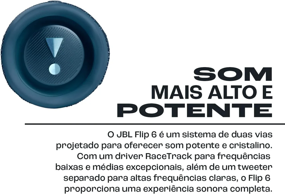 Sistema de 2 vias: a flip 6 conta com um sistema de áudio avançado, incluindo um driver otimizado em forma de pista para graves e médios, um tweeter separado para agudos nítidos, e radiadores de graves duplos para uma experiência sonora rica e completa.