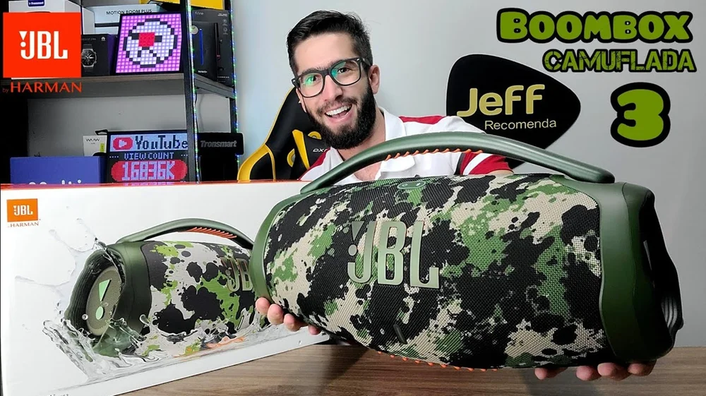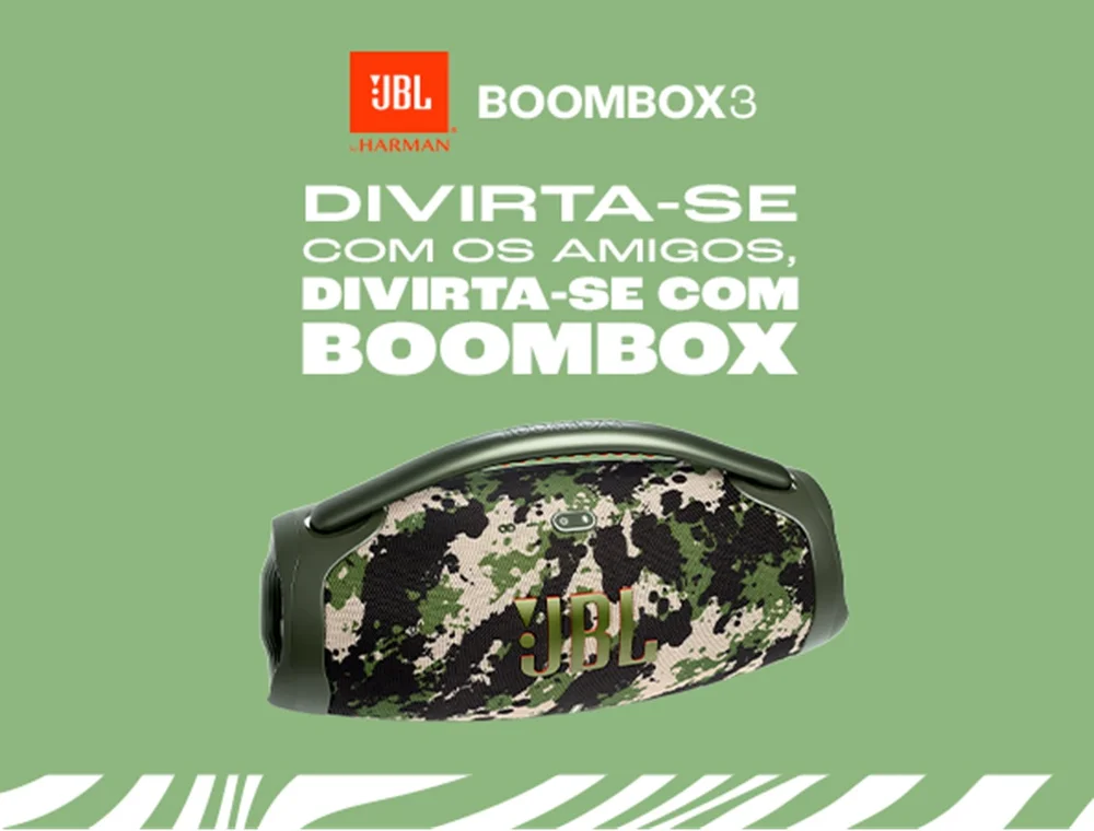 adquira já a sua jbl boombox 3 camuflada e tenha em mãos um dispositivo de áudio que combina a lendária qualidade de som da jbl com durabilidade, estilo militar e recursos para levar a festa para onde você for.