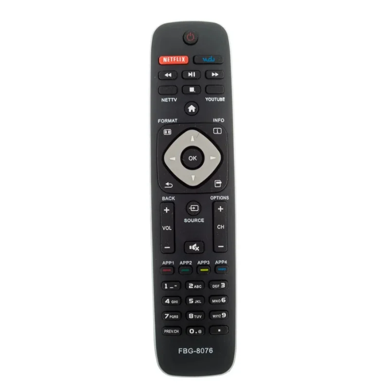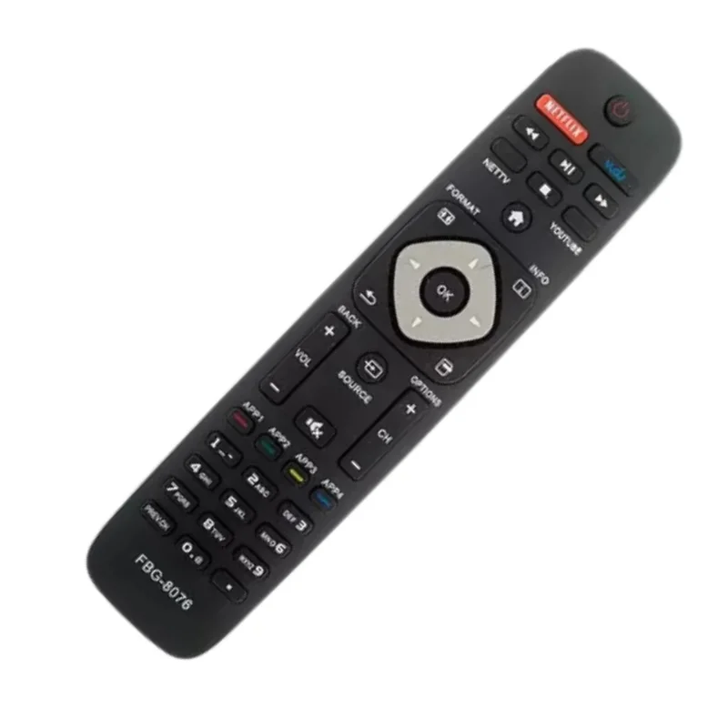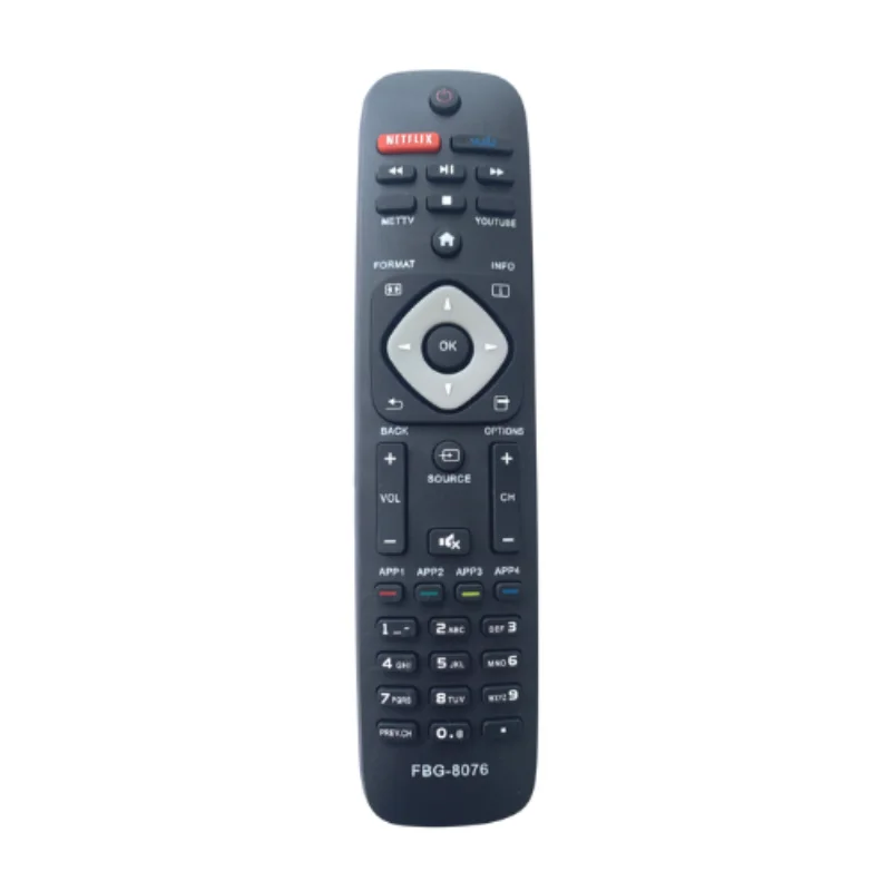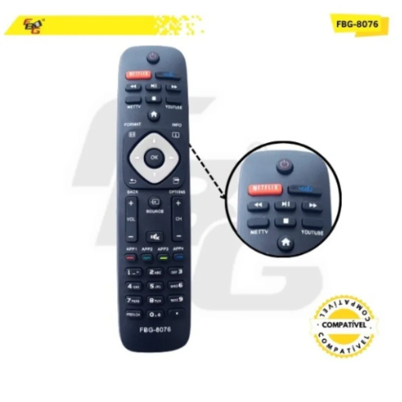 Marca: FBG Modelo: FBG-8076 Compatibilidade: Controle compatível Com Smart Tv Led Da Marca Philips. Possui Teclas Home, Netflix E Vudu - Modelos: 26PFL3404D / 32PFL3404D / 32PFL5604D / 42PFL3604D / 42PFL5604D / 42PFL7404 / 47PFL5604D / 52PFL7404D / 42PFL7007 / 47PFL7007G / 32PFL6007 / 32PFL5007G / 42PFL5007G / 32PFL5007G-78 / 32PFL4007 / 37PFL4007 / 42PFL7007G / 47PFL4007 / 42PFL3007 / 32PFL3707 / 46PFL4508G-78 / 42PFL4508G / 55PFL7007G/78 / 55PFL6007G/78 / 47PFL4007G/78 / 47PFL3007D/78 / 42PFL7007G/78 / 42PFL5007G/78 / 42PFL4508G/78 / 42PFL4007G/ 78 dentre outros. Material: Plástico e teclas de borracha Cor: Preto Pilhas: Não inclusas