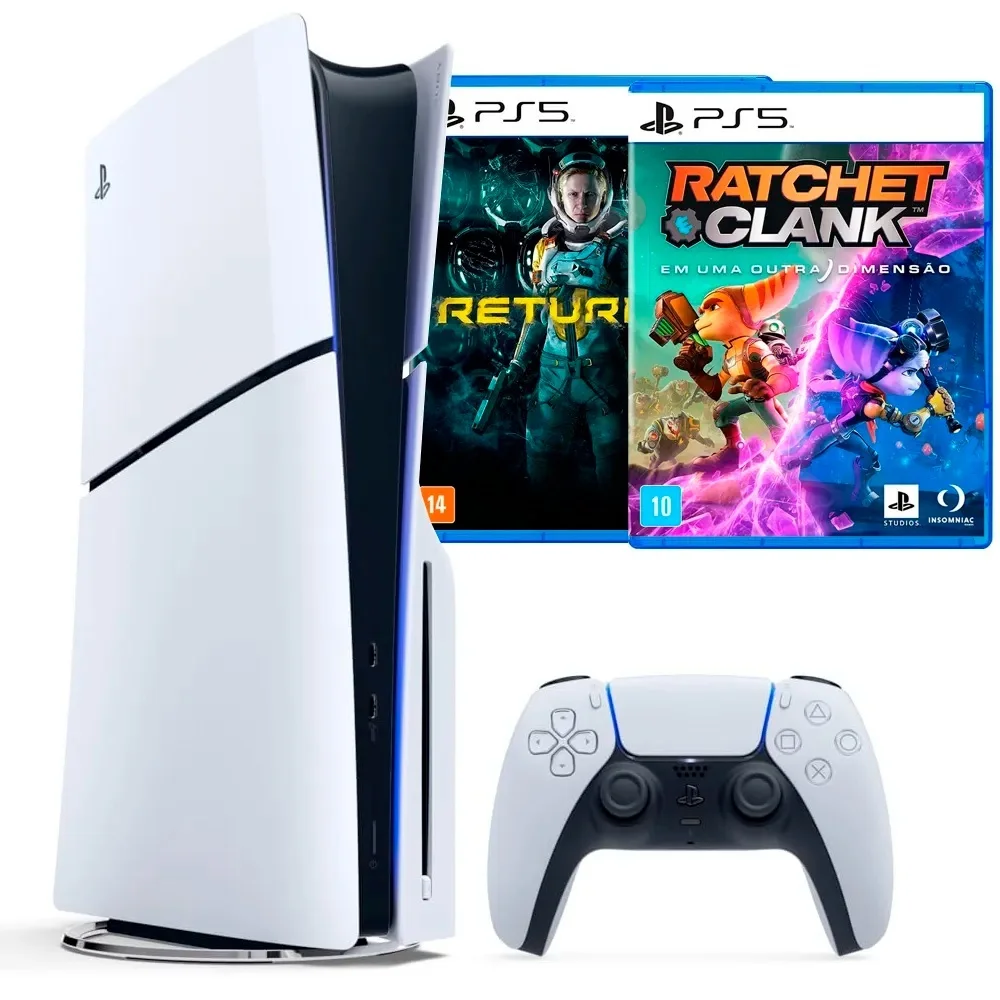 O Sony PlayStation 5 Slim 1TB CFI-2015B é um console de nova geração mais compacto, lançado em 2023, e que neste pacote inclui os aclamados jogos Returnal e Ratchet & Clank: Em Uma Outra Dimensão. Projetado para oferecer uma experiência de jogo imersiva, ele apresenta um design moderno e slim, além de recursos avançados como áudio 3D e feedback tátil do controle DualSense. Visão geral O PS5 Slim com leitor de disco removível se destaca por sua alta performance, garantida pela CPU e GPU customizadas, e por um SSD ultrarrápido de 1TB que elimina as telas de carregamento. A resolução máxima de até 4K é suportada e o console oferece tecnologia de Ray Tracing, que simula o comportamento da luz de maneira realista para gráficos mais imersivos. O que está incluído Console PlayStation 5 Slim (CFI-2015B): Modelo com leitor de disco Blu-ray Ultra HD. Controle sem fio DualSense: Possui feedback tátil e gatilhos adaptáveis que aumentam a sensação de imersão nos jogos. Armazenamento: 1TB SSD, que oferece mais espaço do que o modelo original. Jogos: Voucher com códigos para download de Returnal e Ratchet & Clank: Em Uma Outra Dimensão. O jogo ASTRO's PLAYROOM também vem pré-instalado. Acessórios: Cabo HDMI, cabo de alimentação e cabo USB. Jogos inclusos Returnal: Um jogo de tiro e ação em terceira pessoa com elementos roguelike. A jogabilidade combina ação intensa com um enredo de ficção científica cativante, onde cada morte reinicia o ciclo em um planeta hostil. Ratchet & Clank: Em Uma Outra Dimensão: Um jogo de plataforma e aventura que tira proveito da velocidade do SSD do PS5 para carregar diferentes dimensões de forma quase instantânea. É um show de gráficos e humor para todas as idades. Saiba mais Suporte: Este modelo acompanha dois pés de suporte horizontal. O suporte vertical é vendido separadamente. Compatibilidade: O console é retrocompatível com a grande maioria dos jogos de PlayStation 4. Áudio 3D: Com o motor Tempest 3D AudioTech, o console oferece uma experiência sonora imersiva com fones de ouvido ou alto-falantes embutidos na TV.