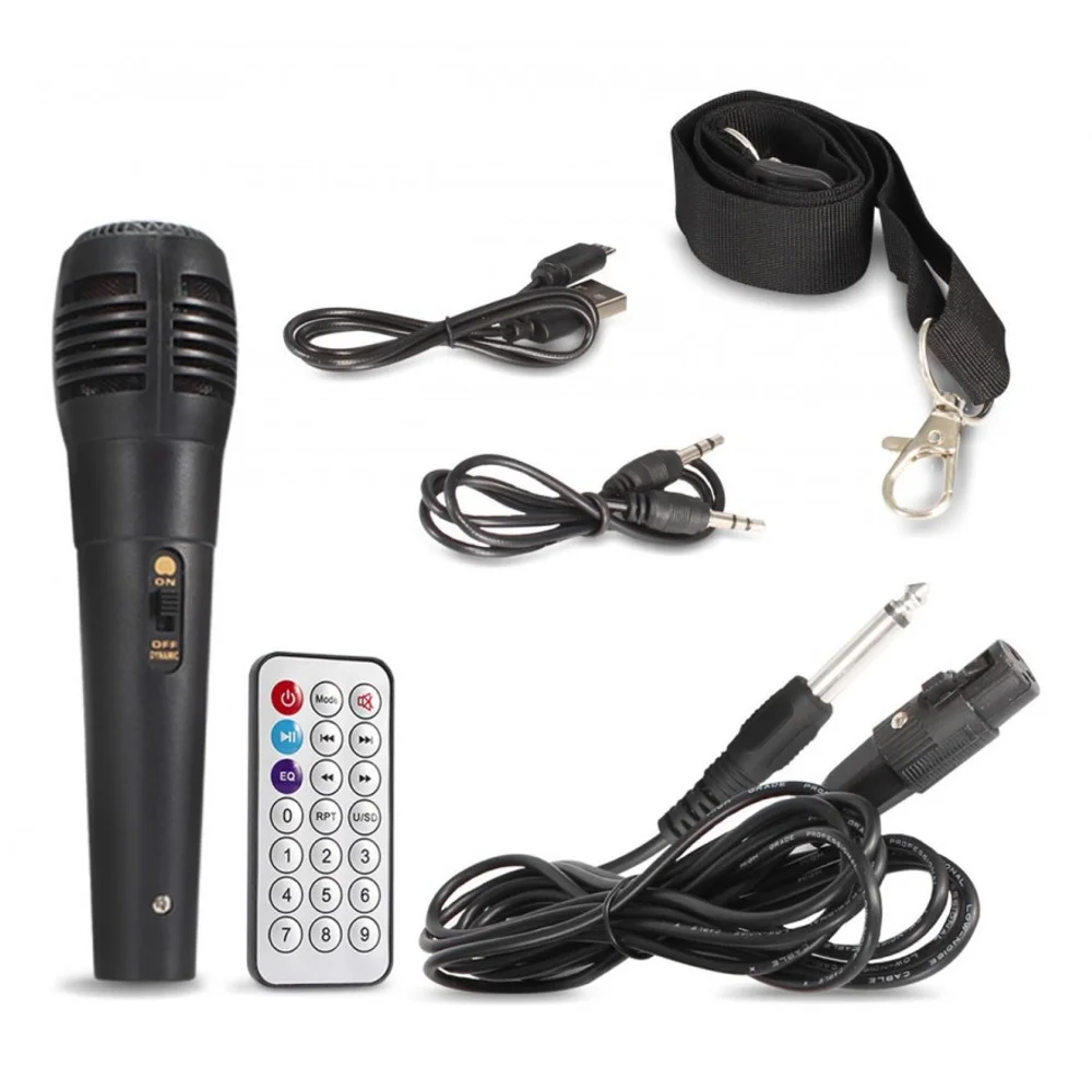 Caixa de som com leds RGB, entrada para dois microfones e alça para descolamento.