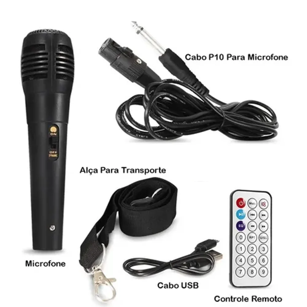 Microfone Karaokê Profissional: Liberte seu talento vocal com o microfone de alta sensibilidade incluído. Projetado para capturar sua voz com clareza e precisão, permitindo que você brilhe como uma estrela no centro do palco.
