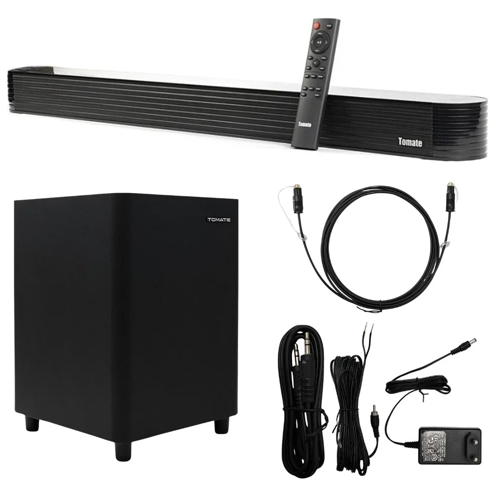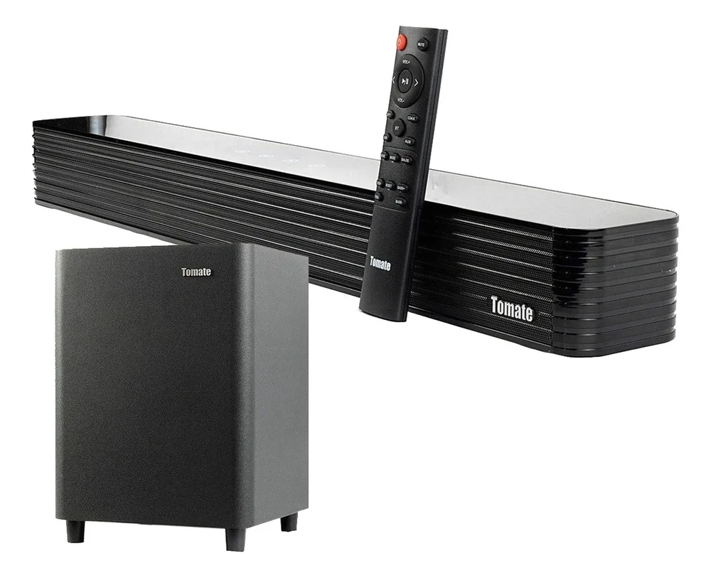 Transforme sua experiência de entretenimento com o Kit Soundbar e Subwoofer Tomate Bluetooth. Equipado com tecnologia de som surround, o sistema combina uma soundbar compacta e potente com um subwoofer de alta definição, proporcionando um som claro e graves profundos.