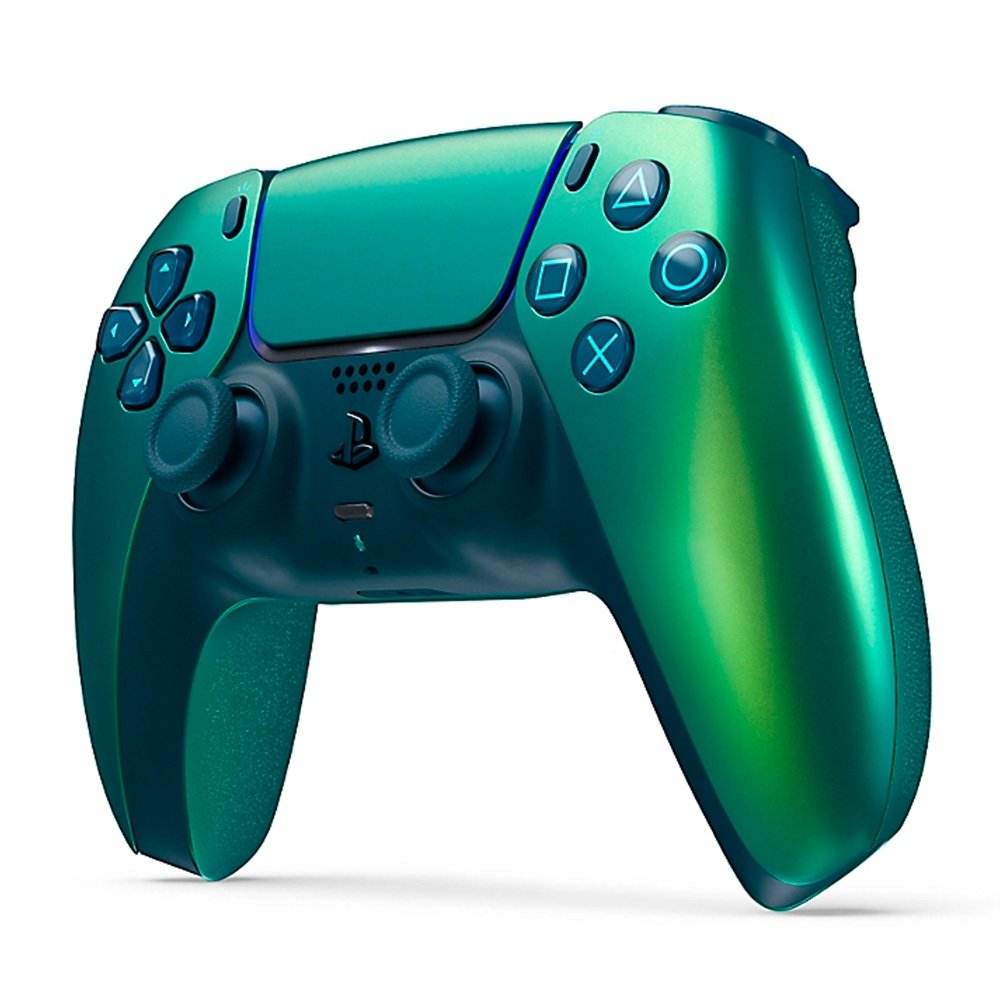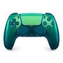 Este modelo integra a exclusiva Chroma Collection. São Controles sem fio DualSense com acabamento iridescente que brilham, cintilam e mudam de cor de todos os ângulos. O Chroma Teal está disponível junto com as versões Pearl e Indigo.