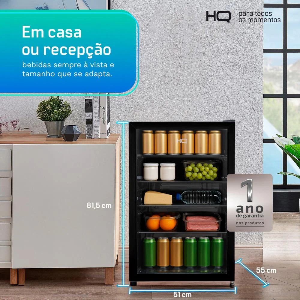 frigobar expositor vertical hq vidro duplo 130 litros preto hq-130fbpvlo frigobar hq-130fbpvl é a escolha para quem precisa de mais capacidade com cara de vitrine. a porta de vidro e a luz interna exibem bebidas com clareza, as prateleiras de vidro ajustáveis adaptam o espaço para latas e garrafas maiores. o termostato 0–5 facilita o controle de frio (bebidas 5–12°c) e o defrost deixa a manutenção rápida. vai bem em casas com área gourmet movimentada, salas amplas, quartos de hóspedes, e em recepções e salas de espera.por que isso importa no dia a dia? - mais volume, menos bagunça: tudo visível e separado por categoria. - pronto para receber: reabastecimento rápido em festas e encontros. - operação direta: ajuste no botão e limpeza sem segredos.destaques técnicos e funcionais - porta de vidro + luz interna (exposição clara). - prateleiras de vidro ajustáveis. - termostato mecânico 0–5 (uso típico 2–3). - faixa sugerida p/ bebidas: 5–12 °c (não congela). - degelo manual (defrost). - refrigerante r600a.cenários de uso casa: área gourmet grande, sala de estar, eventos, maratonas de série. profissional: recepção, salas de espera, break room, locações.orientações de uso - 2–6 h pós-transporte antes de ligar, depois 2–3 h para estabilizar. - ajuste inicial em “3”, refine conforme a carga.facilidade de limpeza desligue, faça o degelo manual, pano macio e detergente neutro, seque e religue.segurança tomada exclusiva e aterrada, sem adaptadores. não insira aparelhos elétricos no interior. manuseie com cuidado r600a é inflamável.sustentabilidade r600a + instalação correta = eficiência e menor impacto ambiental.especificações técnica modelo: hq-130fbpvl capacidade: 130l controle de temperatura: 0–5 (típico 2–3) uso recomendado: 5–12 °c (bebidas), não congela degelo: manual iluminação: sim prateleiras: vidro ajustáveis refrigerante: r600a voltagem: 127v ou 220v (não é bivolt) frequência:60 hzinstalação: folgas 5–7,5 cm (traseira), 10 cm (laterais), 20 cm (topo).dimensões e peso do produto altura:81,5 cm largura:51 cm profundidade:55 cm peso:29,5kggarantia 01 ano (sendo 3 meses de garantia legal e mais 9 meses de garantia para defeito de fabricação).