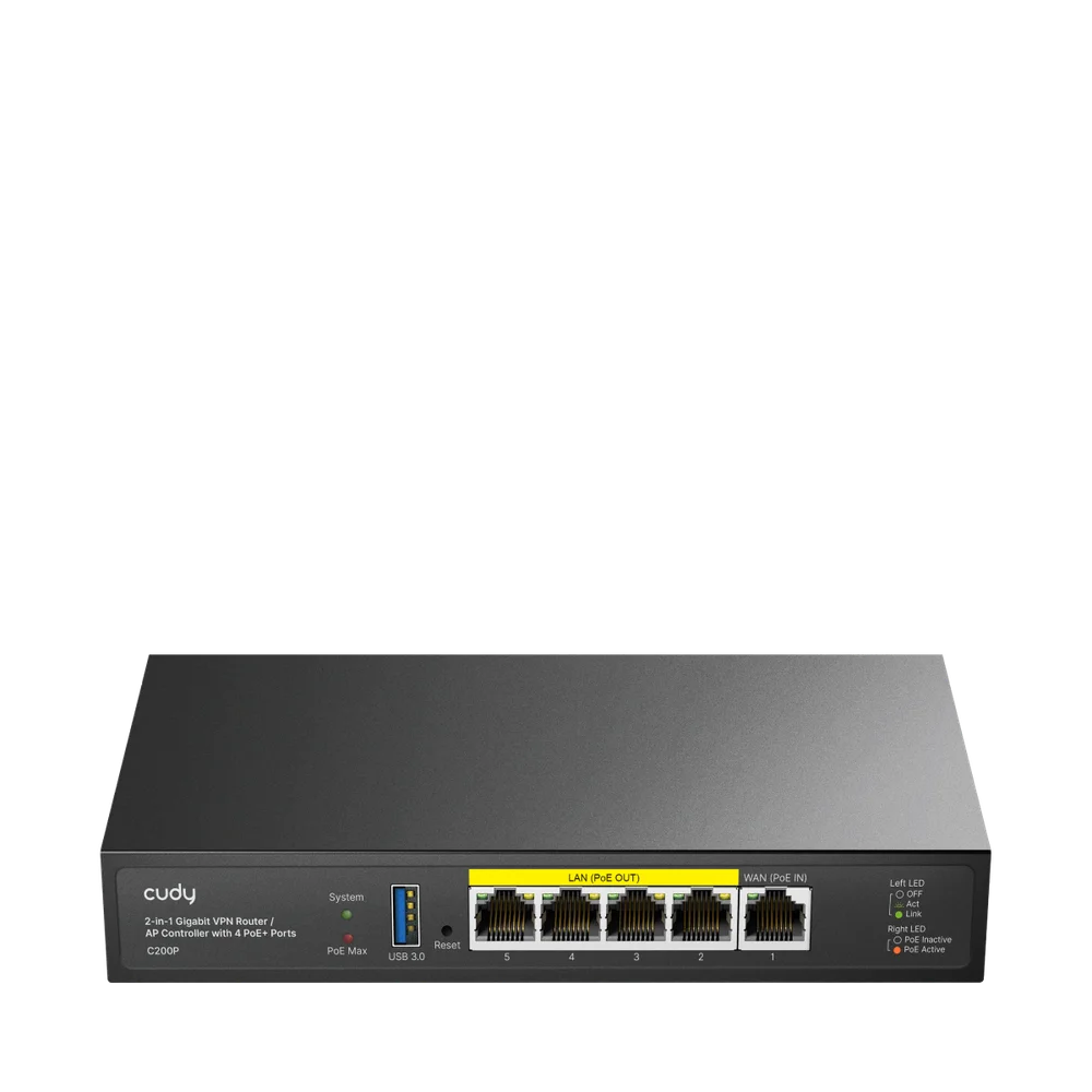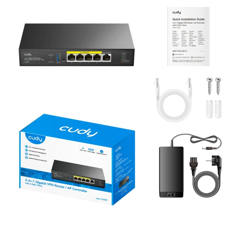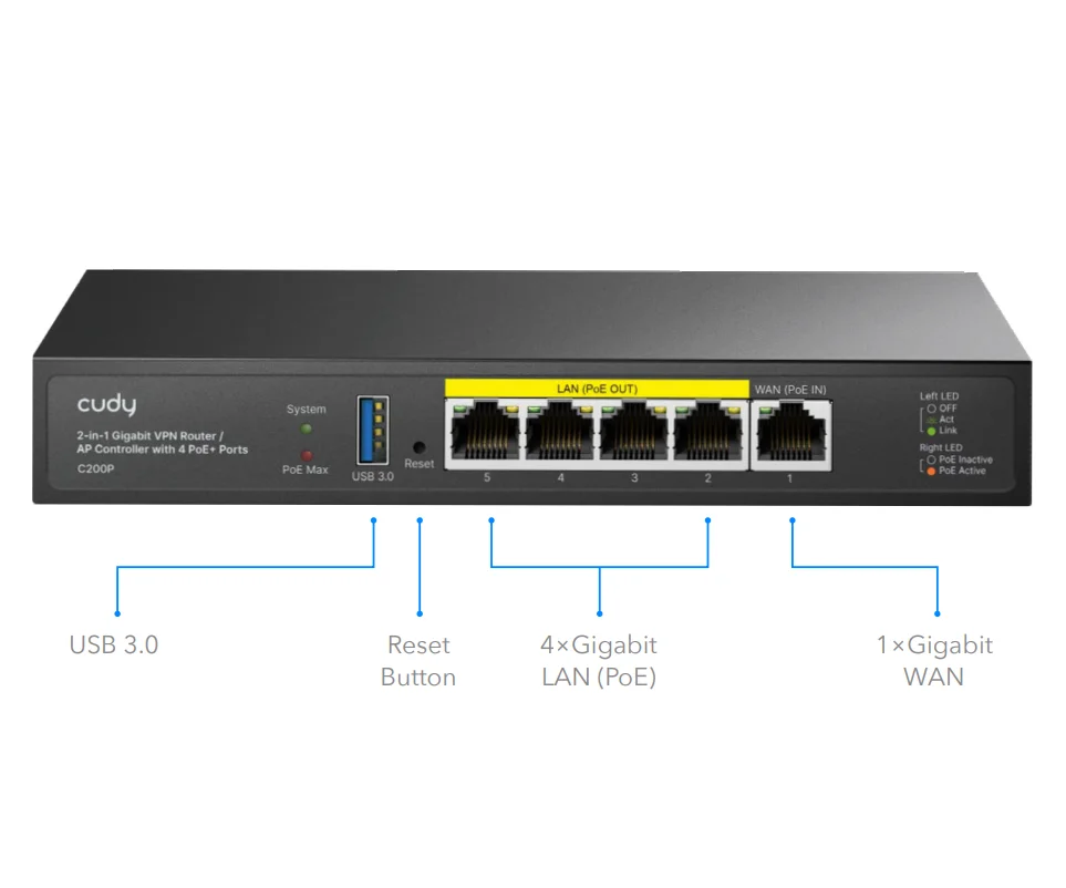 PRINCIPAIS CARACTERÍSTICAS - Um roteador Gigabit que funciona como controlador de pontos de acesso Cudy em demandas de Wi-Fi em toda a casa, apresentando quatro saídas PoE e recursos Cudy Mesh - 4× GbE com PoE 802.3at/af Modo A - 1 porta Gigabit Ethernet - 1 porta USB 3.0 - Fonte de alimentação de 60 W - Gerenciar 200 APs - Portal Cativo - Cudy Mesh, Servidor e Cliente VPN