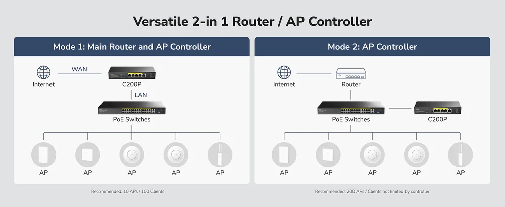 Controlador de Roteador/AP 2 em 1 Versátil O C200P combina a funcionalidade de um roteador e um controlador de AP, permitindo o gerenciamento centralizado de múltiplos APs e otimizando a topologia da rede. Ele também pode ser usado exclusivamente como controlador de AP para atender a diversas necessidades de rede.
