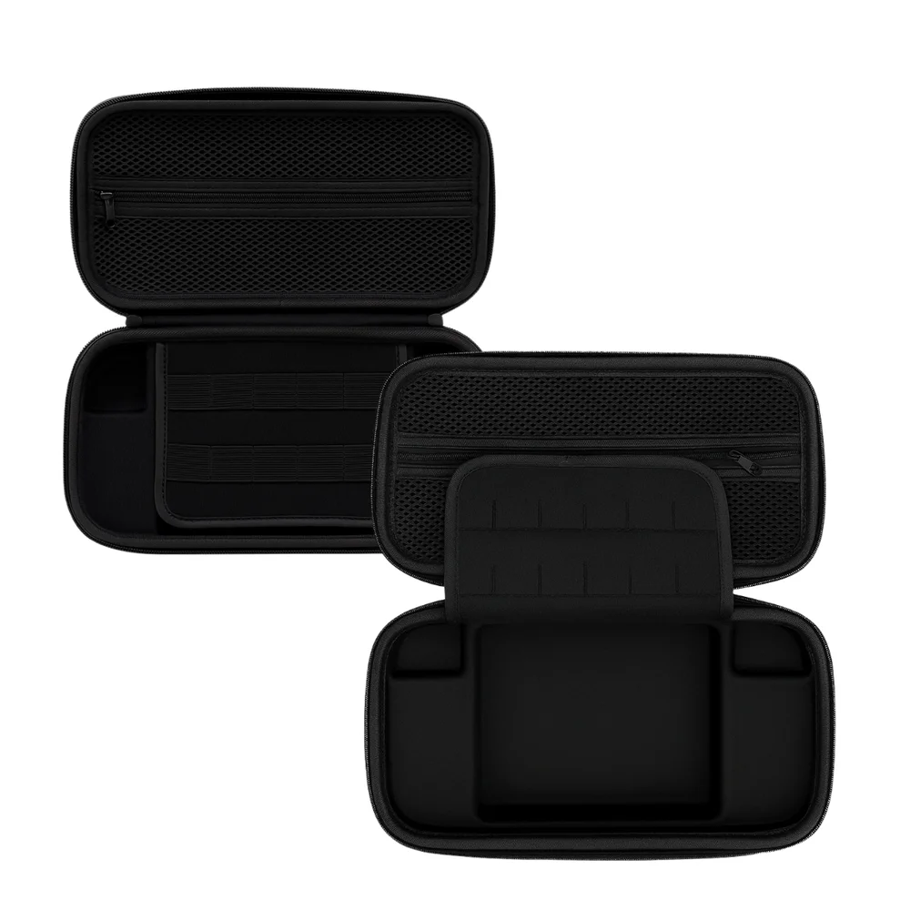 Inclui uma bag rígida em EVA com compartimentos para console, acessórios e até 12 jogos, uma película de vidro 9H ultra resistente e um kit com 3 pares de grips analógicos em silicone antiderrapante, em diferentes tamanhos para mais precisão e conforto durante suas partidas.