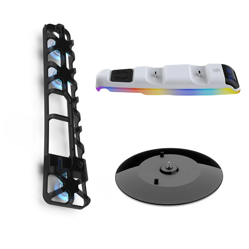 Composto por 1 base, 1 cooler potente com iluminação azul, e 1 estação de carregamento RGB para controles, este kit oferece tudo o que você precisa para manter o seu console refrigerado, seguro e com visual moderno.