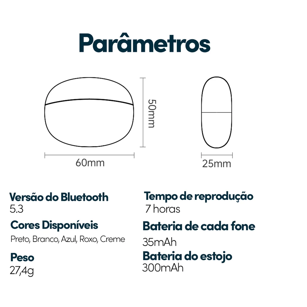 Destaques do Produto: Redução Inteligente de Ruído (ENC): chamadas e músicas sem interferências. Som de Alta Definição: áudio potente e envolvente para todas as situações. Duplo Encaixe Ergonômico: ajuste seguro e conforto prolongado. Bateria de Longa Duração: até 35h de reprodução contínua com estojo. Resistente à Água e Suor (IPX6): ideal para treinos e uso diário. Conexão Estável via Bluetooth 6.0: rápido pareamento e alta eficiência energética.