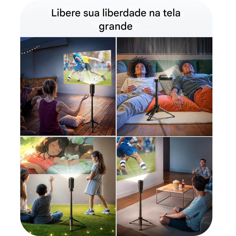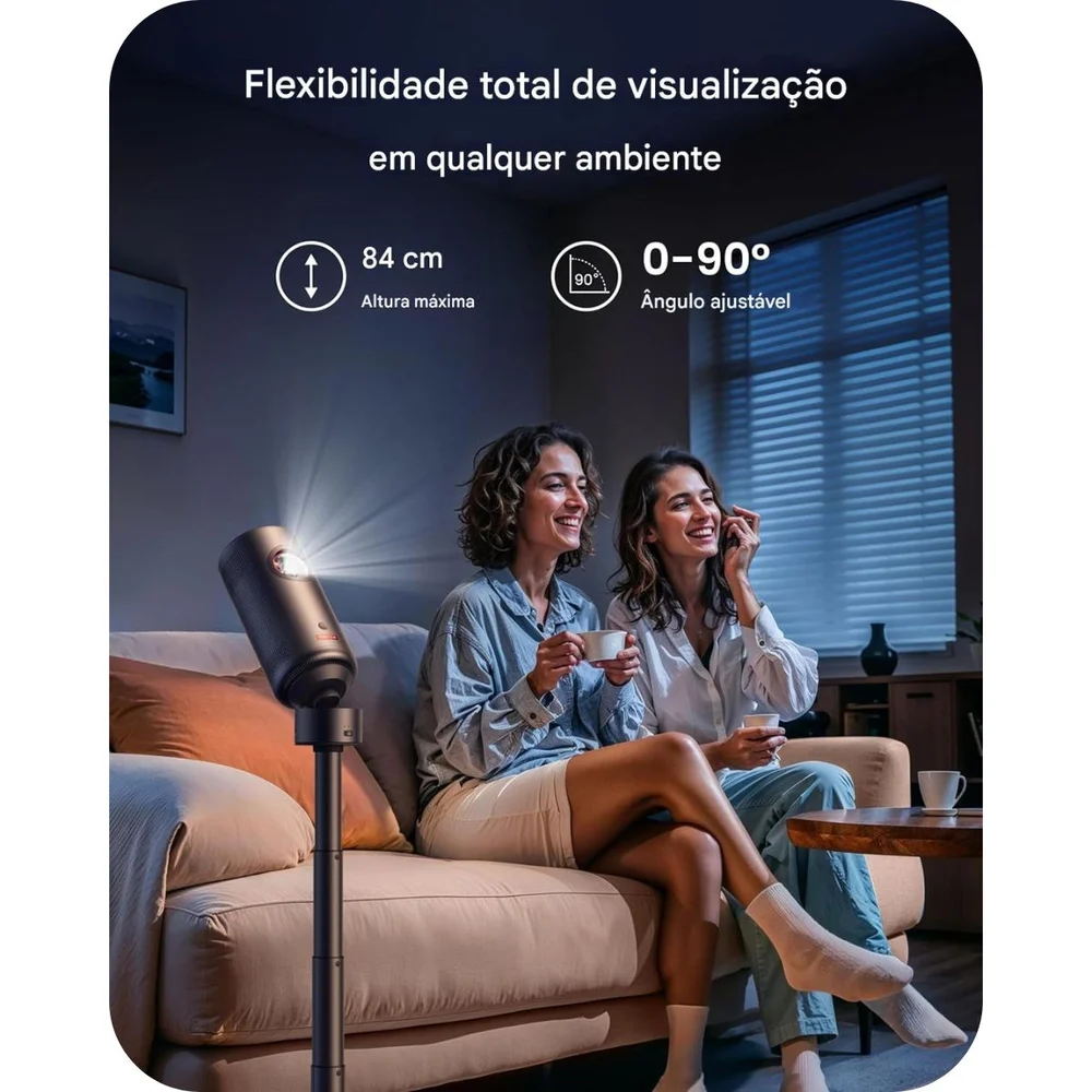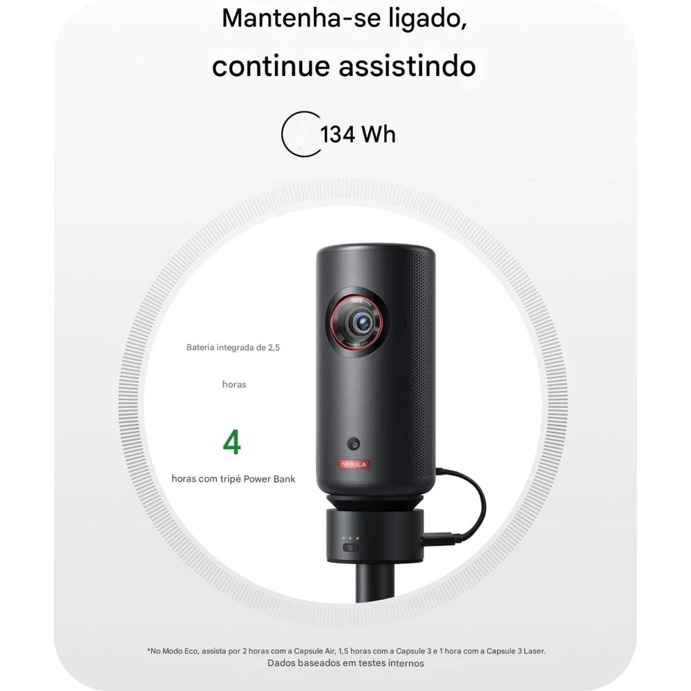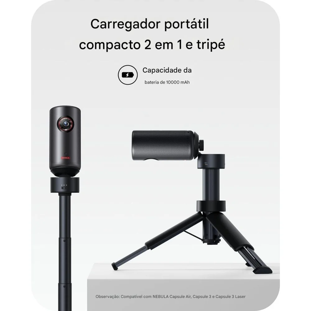 Tripé Portátil Nebula Capsule Power Bank, o acessório 2 em 1 que oferece sustentação estável e energia extra onde você estiver! Capsule Air, Capsule 3 Laser e Capsule 3), combinando portabilidade extrema com uma bateria integrada para estender seu tempo de projeção.Autonomia e Carregamento Power Bank embutido, capaz de fornecer até 2 horas de duração adicional da bateria para o seu projetor, ideal para aquela sessão de filme ou apresentação que precisa de um tempo extra longe da tomada. Ele também suporta carregamento pass-through de 30W, permitindo que você assista e carregue o projetor simultaneamente.Portabilidade e Ajuste Profissional Configuração Ultrarrápida: Com um sistema de desdobramento one-click, o tripé é configurado em apenas 3 segundos, pronto para uso imediato. Altura e Ângulo Flexíveis: Ajuste a altura de 215 mm (8,5 polegadas) a 840 mm (33 polegadas), garantindo o posicionamento perfeito para qualquer ambiente. A cabeça do tripé pode ser ajustada em um ângulo de visão de 0 a 90 graus, facilitando a busca pelo melhor ângulo de projeção (teto ou parede). Design de Bolso: Com um peso de apenas 0,86 kg (1,9 lb) e medindo somente 6,6 cm (2,6 polegadas) de altura quando dobrado, ele é compacto o suficiente para caber facilmente em sua mão ou mochila. O que vem na caixa: