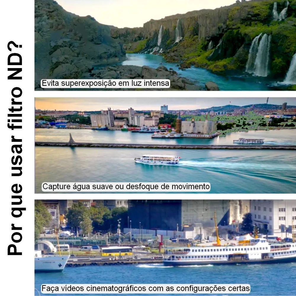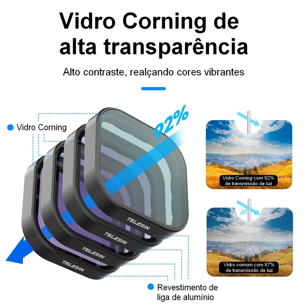 Este kit de filtros ND e CPL da renomada marca Telesin, consiste em 4 filtros de densidade neutra (ND8, ND16, ND32 e ND64), que reduzem a quantidade de luz visível que entra na lente, permitindo ao usuário utilizar aberturas mais amplas ou velocidades mais lentas do obturador, especialmente em condições de muita luz. E ainda acompanha um filtro CPL (polarizador), que têm como principais funções eliminar a luz não metálica refletida e que pode acabar prejudicando as imagens, aumentar a concentração de cores para realçar o azul do céu, destacar as nuvens brancas e tornar a imagem mais bonitas. Também consegue melhorar a claridade das imagens e criar fotos e vídeos mais expressivos e vívidos. É frequentemente usado para fazer imagens através de vidro, água e cenários subaquáticos.