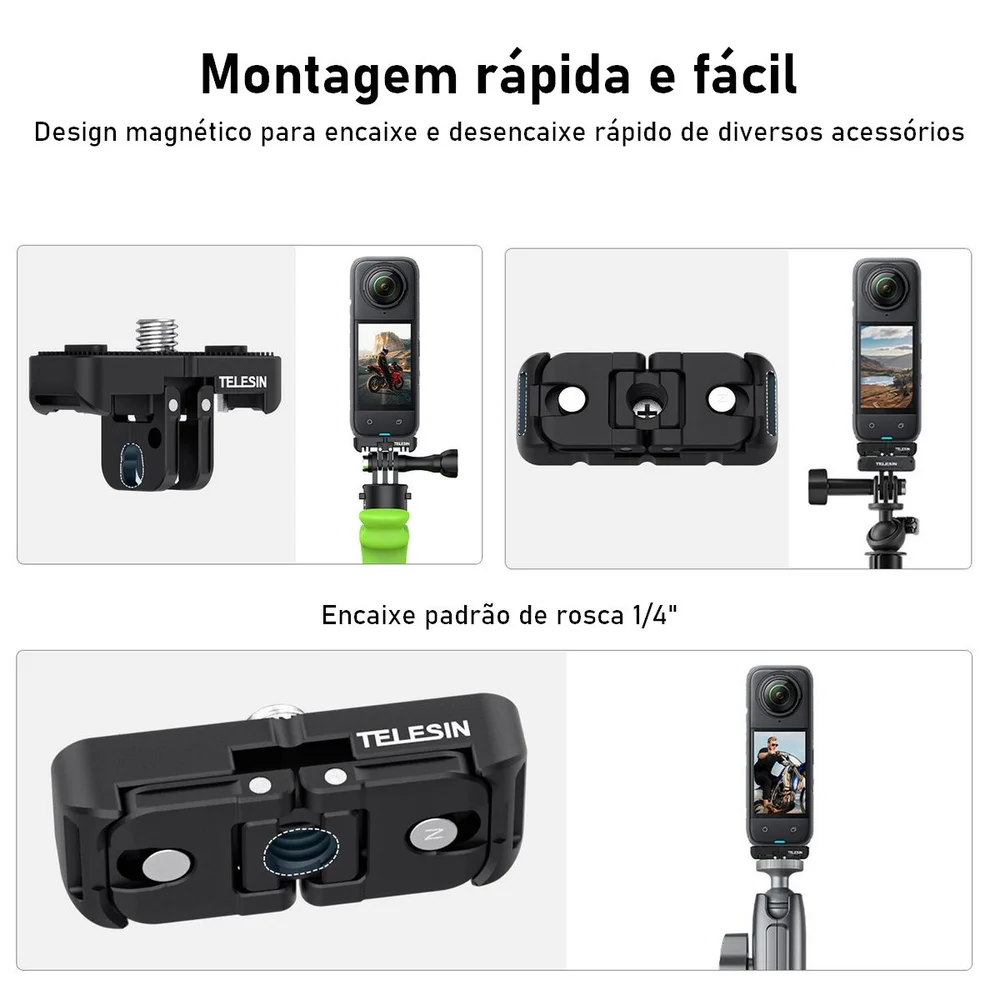 Graças à rosca padrão de 1/4"-20, ele é compatível com a maioria dos suportes e acessórios do mercado, aumentando significativamente as possibilidades de montagem da sua câmera. Um item indispensável para criadores que querem expandir o potencial da Insta360 X4 sem abrir mão da qualidade.