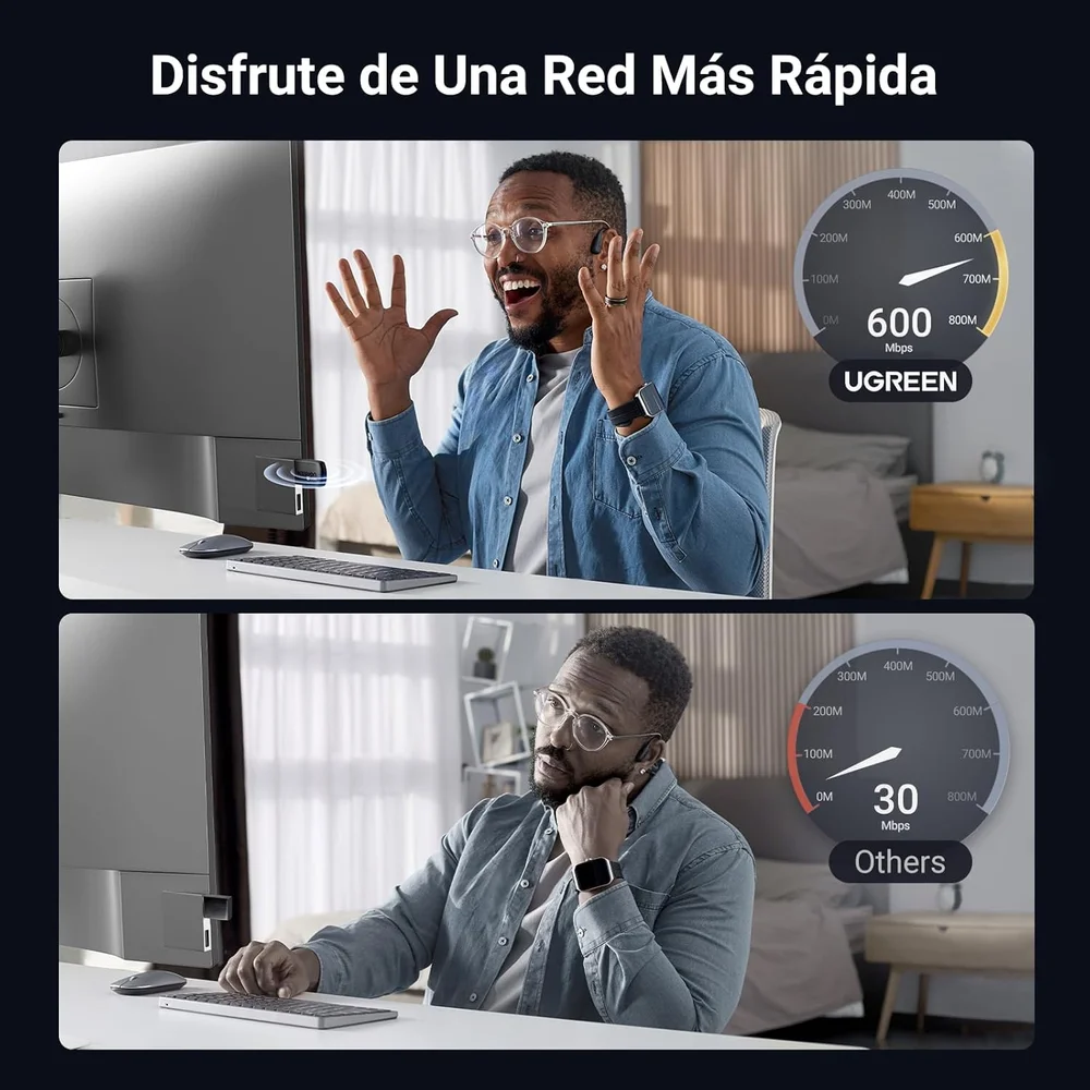 WiFi 6 vs. WiFi 5 Comparado ao WiFi 5, o adaptador AX900 WiFi 6 suporta conexões de banda larga de banda dupla em 5 GHz (teoricamente até 600 Mbps) e 2,4 GHz (teoricamente até 286 Mbps). As velocidades reais de transmissão podem ser reduzidas por fatores ambientais e outras influências. De acordo com os testes de laboratório da UGREEN, o produto atende às necessidades de usuários com velocidades de banda larga abaixo de 300 Mbps.