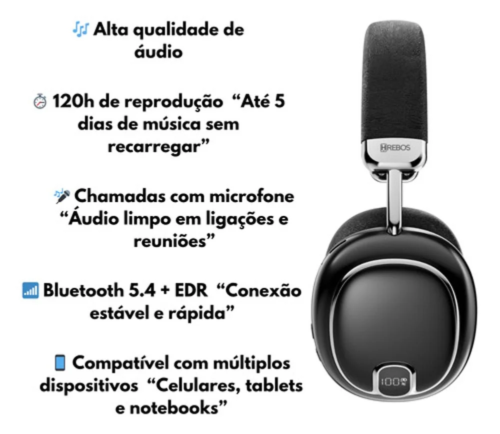 Com almofadas macias e ajuste ergonômico, o Hrebos HP-204 proporciona conforto prolongado, mesmo em longos períodos de uso. Compatível com diversos dispositivos, como celulares, tablets e notebooks, é perfeito para quem valoriza qualidade, durabilidade e design sofisticado.