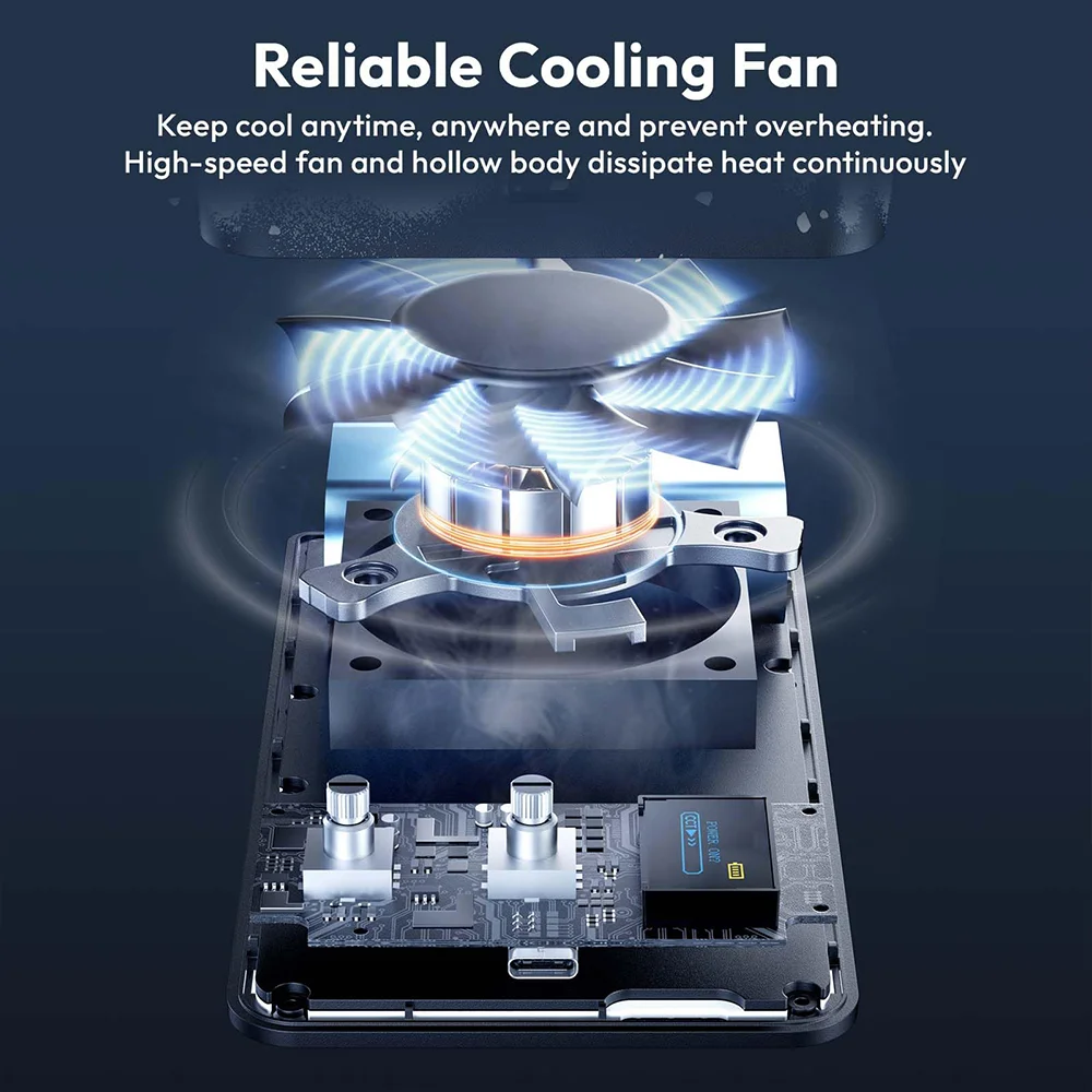 3. Bateria Integrada 5000mAh e Carregamento PD Rápido: Equipada com bateria interna de 37Wh (5000mAh), garante 35 min de uso em potência máxima. A porta Type-C suporta Carregamento PD (Power Delivery), permitindo o uso simultâneo durante o carregamento.