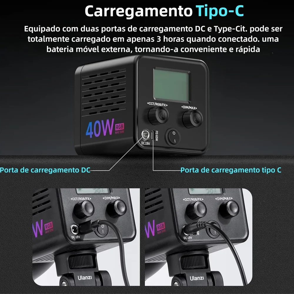 Luz Vídeo Ulanzi 40w Pro RGB Portátil LED Adaptador Dc