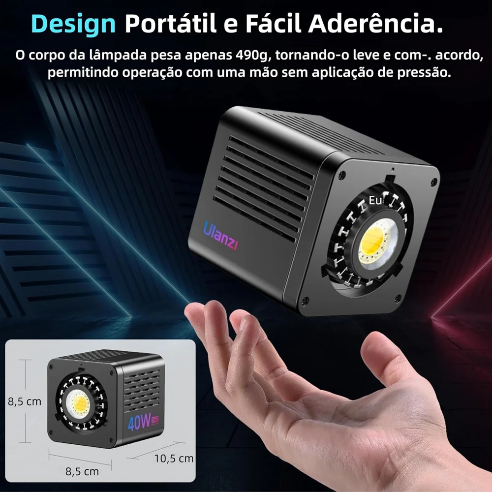 4. Design Compacto e Robusto: Pensada para a vida em movimento, a Ulanzi 40W Pro RGB apresenta um corpo leve e compacto, fácil de transportar e montar em diferentes suportes. Sua construção robusta assegura durabilidade e confiabilidade, tornando-a um investimento inteligente para qualquer criador de conteúdo digital que precisa de iluminação portátil.
