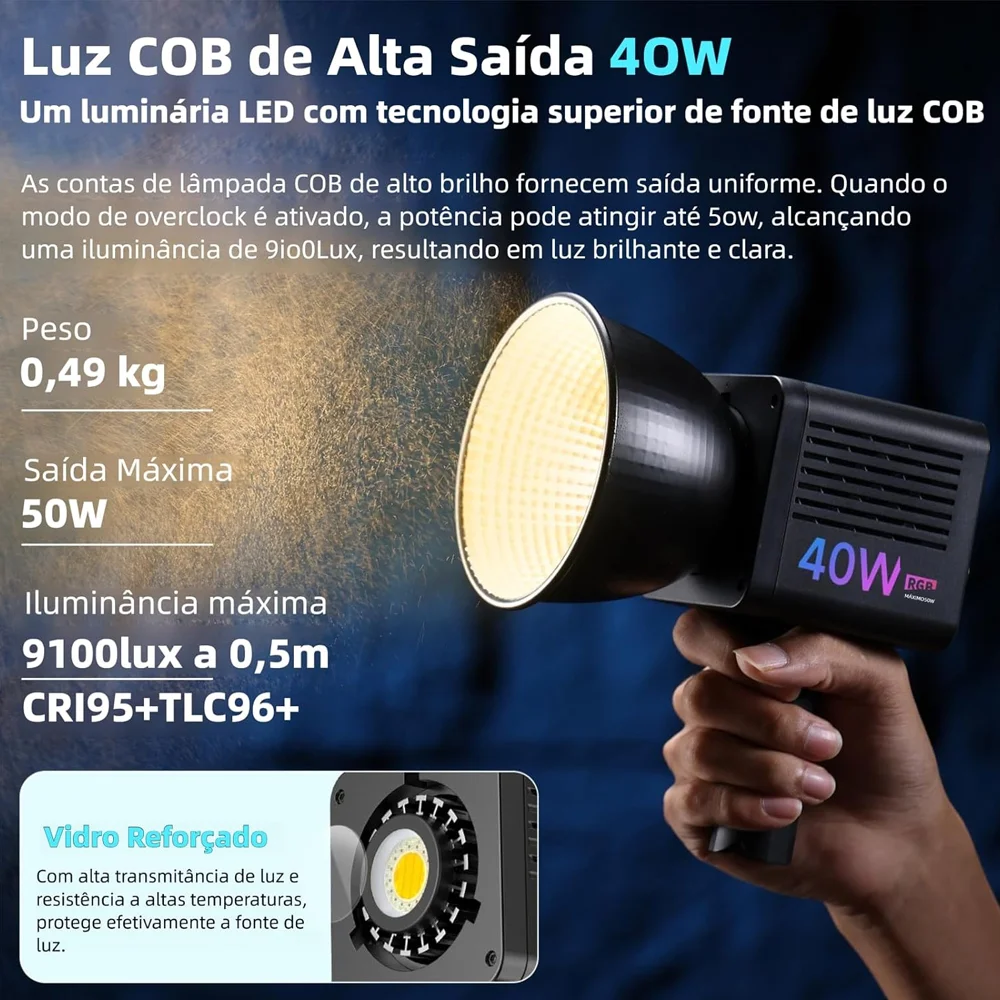 1. Potência e Versatilidade Superior: A Luz de Vídeo Ulanzi 40W Pro RGB oferece 40W de potência luminosa com cores vibrantes RGB, permitindo ajustar a temperatura de cor (CCT) e o brilho para qualquer cenário. Ideal para produção de vídeo profissional, sessões de foto criativas e setups de streaming dinâmicos, esta luz LED portátil garante iluminação de alta qualidade.