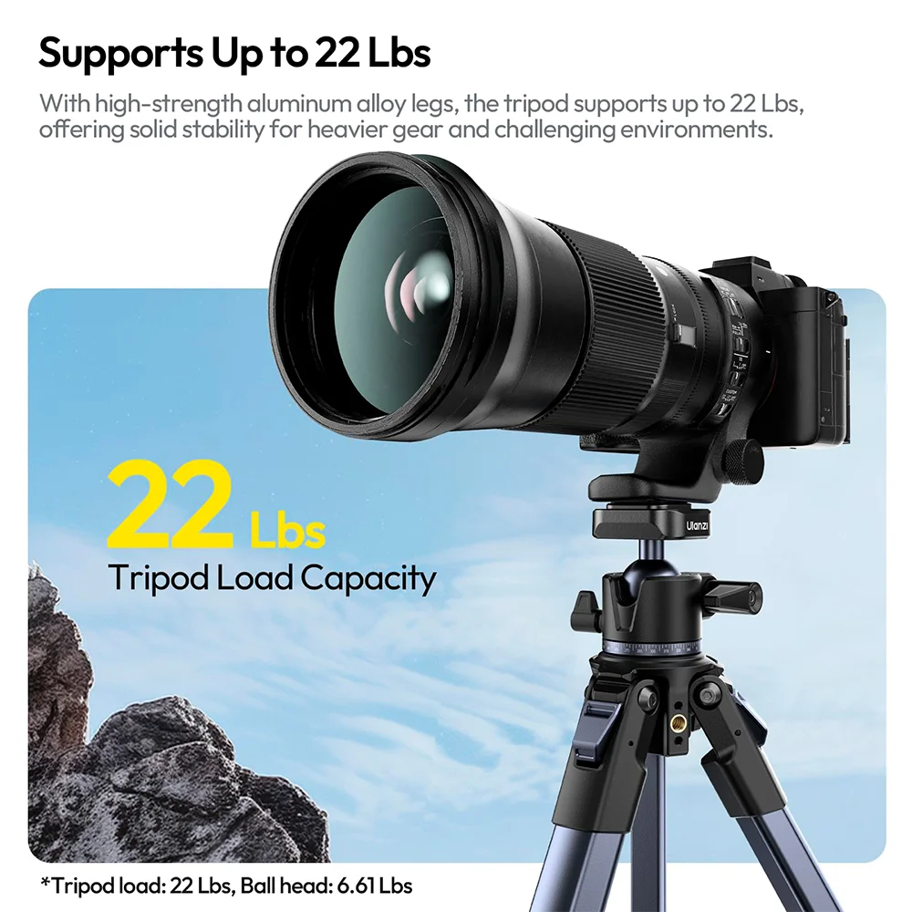 2. Alta Capacidade De Carga e Altura Máxima De 1,56 m: Com estrutura em liga de alumínio, o tripé suporta equipamentos de até 10 kg (câmeras DSLR, mirrorless, luzes). Atinge uma Altura Máxima de 1560 mm, perfeito para fotos de ângulo amplo e alto.