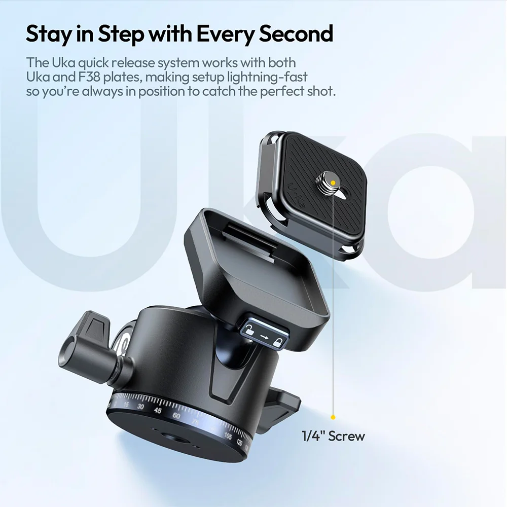 4. Sistema Quick-Release Uka Rápido Para Produtividade: Apresenta o sistema de liberação rápida Uka, compatível com placas Uka e F38. Este diferencial acelera a troca de dispositivos, economizando tempo e garantindo que você não perca o momento da foto ideal.