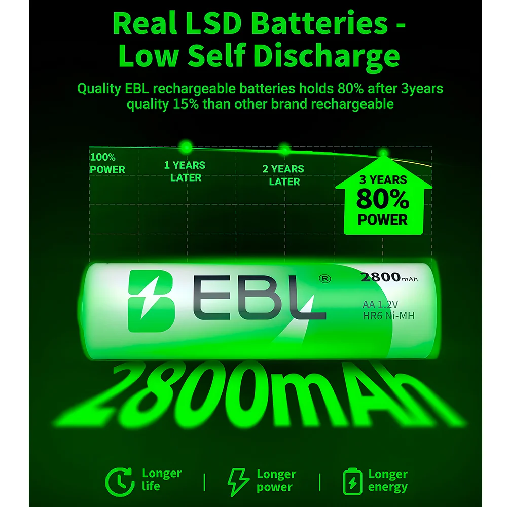 3. Economia Inteligente e Sustentabilidade: Diga adeus ao descarte constante de pilhas! As pilhas EBL AA são totalmente recarregáveis, permitindo centenas de ciclos de carga e descarga. Isso representa uma economia significativa a longo prazo e contribui para um consumo mais consciente e amigo do meio ambiente.