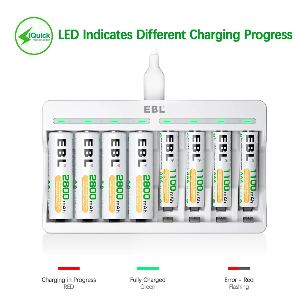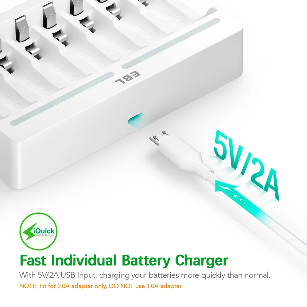 2. Carga Rápida e Eficiente USB: Desfrute da funcionalidade de carregamento rápido com saída USB de 5V 2A, permitindo que suas pilhass recarregáveis EBL e outras sejam carregadas agilmente. Otimizado para um processo ágil e prático, ideal para quem busca economia de tempo e alta performance no dia a dia.
