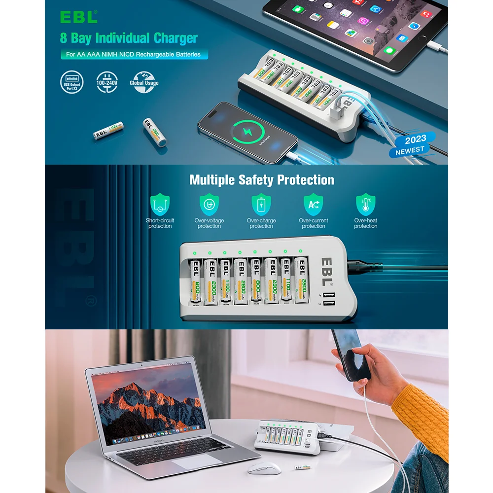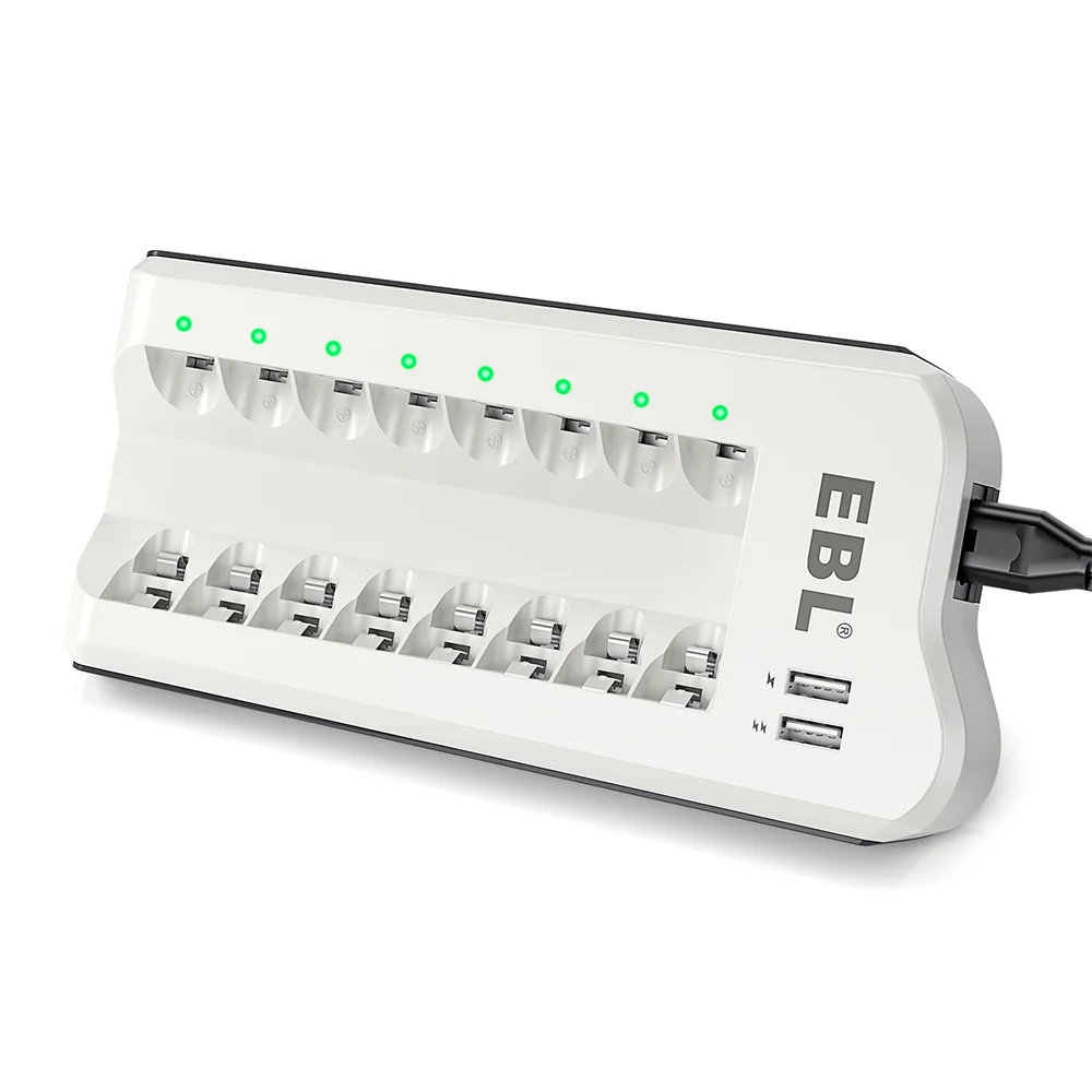 2. Duas Portas USB para Maior Versatilidade Além de carregar pilhas, o carregador EBL possui duas portas USB de saída que permitem recarregar celulares, tablets, fones de ouvido e outros dispositivos simultaneamente. Um acessório multifuncional indispensável para uso doméstico, no escritório ou em viagens.
