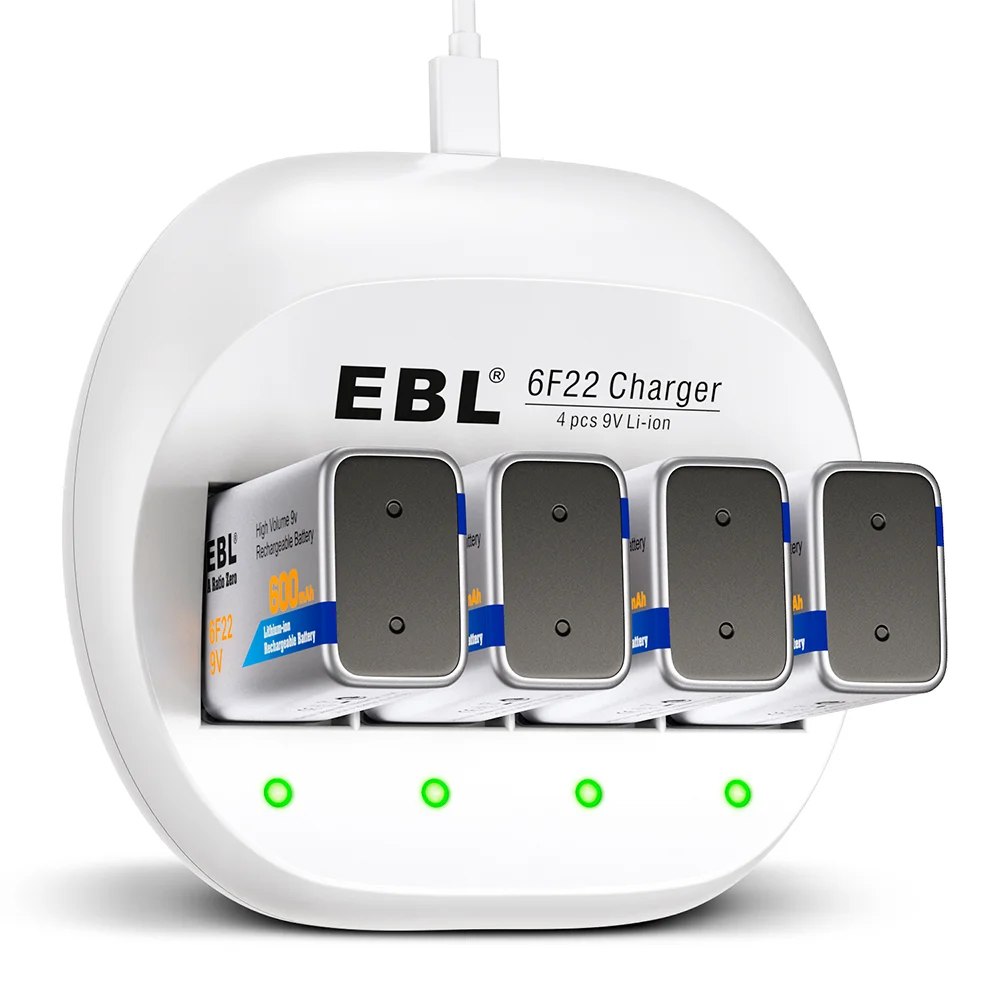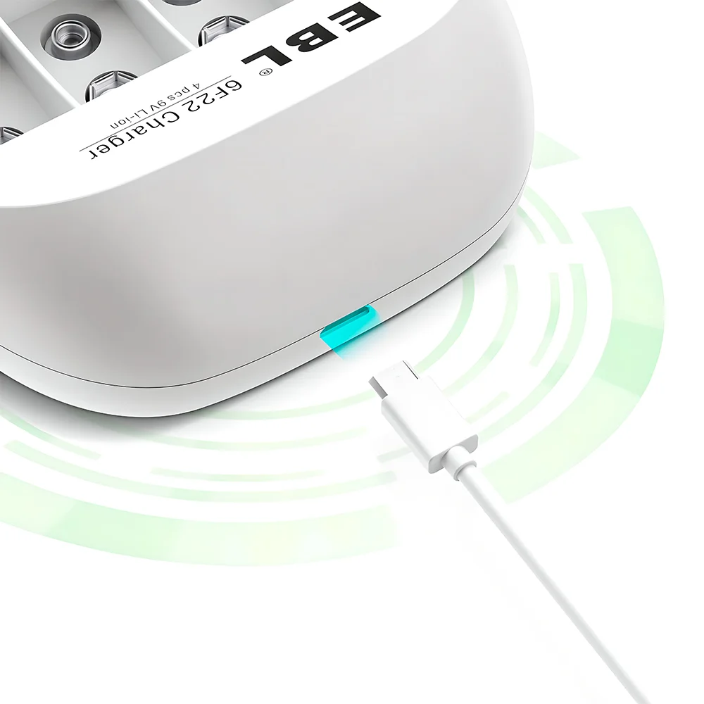 Carregador de Baterias 9V Li-ion EBL, 4 Slots Inteligentes, Carregamento Rápido e Seguro. Modelo LN-6414 com Indicador LED para Baterias Recarregáveis 9V